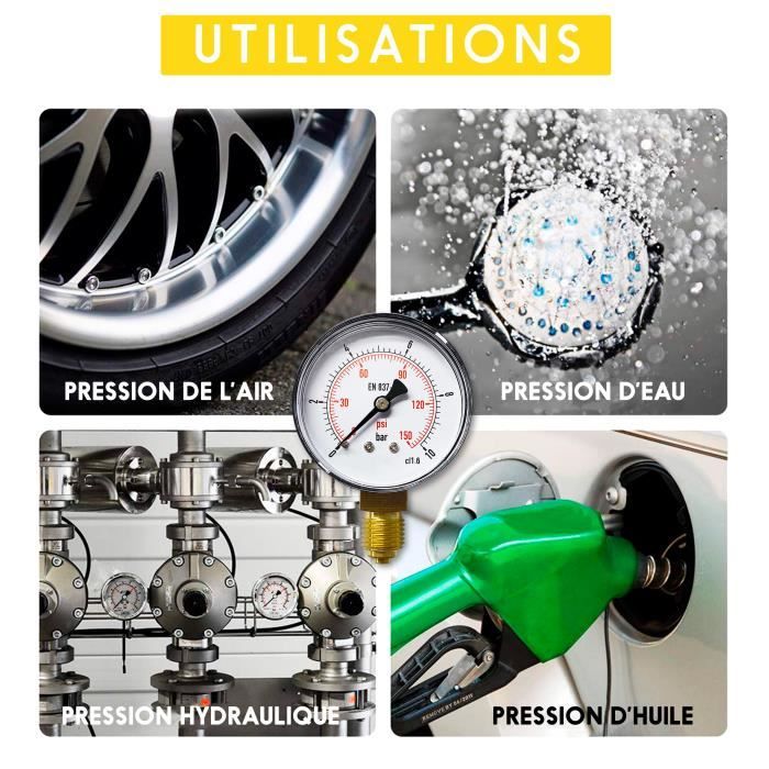 QUNNIE Kit de testeur de Pression d'huile, kit d'outils de Manomètre, 1/4 NPT Laiton Montage Latéral Manomètre De Pression De Ce manomètre aux performances stables, a une échelle pour la mesure de la barre 2,3 face avec raccord fileté 1/4 NPT, monté sur le côté, sa plage de mesure est de 0 à 10 bar Plusieurs types (G, NPT, BSP,...) et tailles (1/2, 1/4, 1/8,...) de connecteurs sont disponibles. Toutefois, il est possible de se procurer un raccord adaptateur en acier inoxydable ou en laiton comme accessoire pour installer le manomètre sur son système pneumatique ou hydraulique