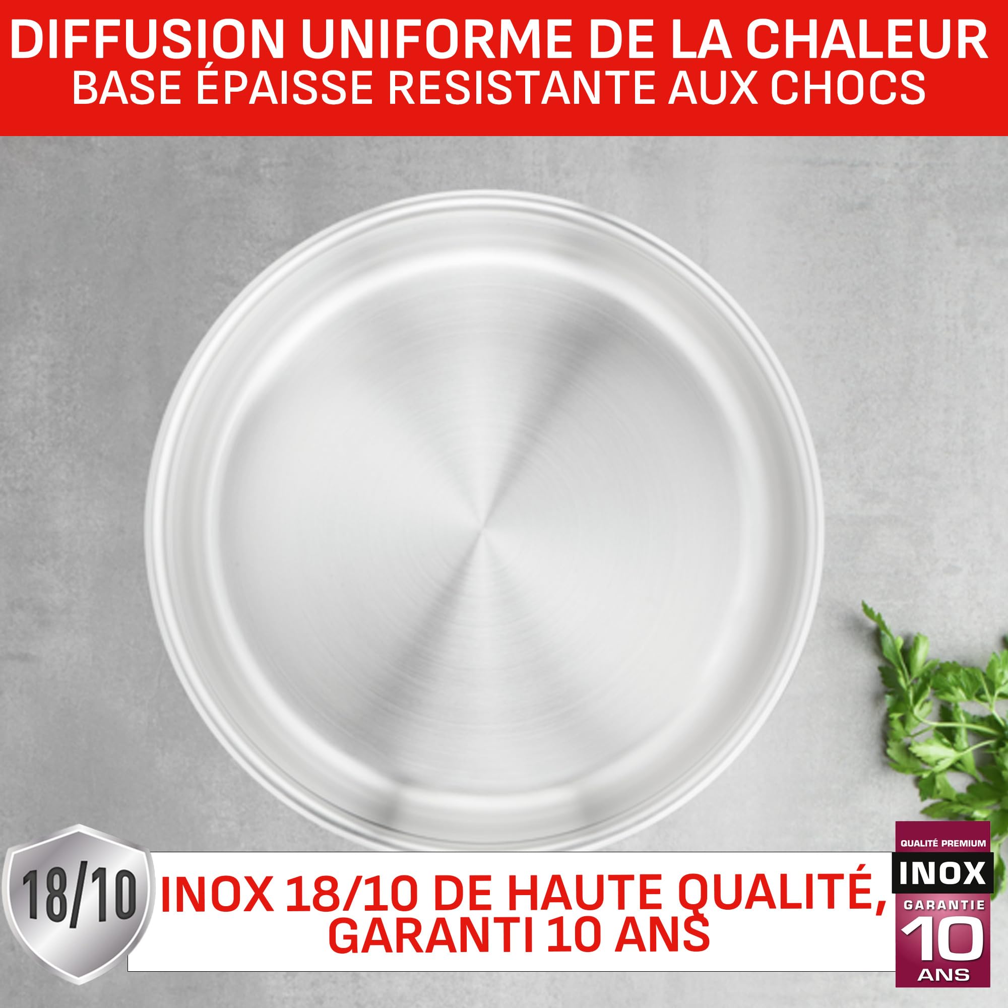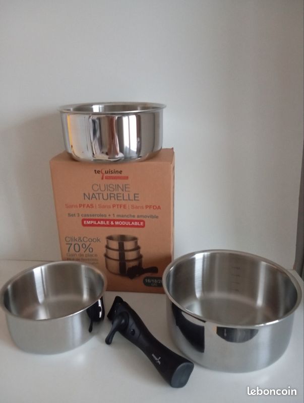Résistant au four jusqu’à 260 °C (500 °F) Le concept amovible permet un empilage parfait des casseroles et faitouts pour un gain de place appréciable, dans les placards comme dans les lave-vaisselle. Pratique, le système de poignée amovible permet de transformer votre casserole inox en faitout en remplaçant la poignée par des anses Compatible lave-vaisselle Facile d’entretien Idéal pour les cuisines compactes et le camping. Si vous avez la moindre question ou préoccupation, n'hésitez pas à nous contacter — nous sommes à votre disposition pour vous aider et garantir votre satisfaction. Casserole Tefal Backen 191105, Set De Casseroles 16,18, 20cm, Inox, 5 Pièces, Induction, 1 Poignée Amovible,1 Couvercle Multipostions Métal, Empilable, Compatible Lave -vaisselle, Gain De Place, Garantie 5 Ans Batterie De Cuisine Induction 1️⃣Composition du Set : Le Set comprend Cinq casseroles de diamètres 18 cm et 20 cm, idéales pour chauffer des sauces, cuire des légumes ou préparer de petites portions de plats. L'inox est également reconnu pour sa capacité à répartir la chaleur de manière uniforme, évitant ainsi les points chauds et assurant une cuisson homogène. 5️⃣[Service après-vente] :Nous sommes fiers de la qualité de notre ensemble de casseroles inox et convaincus que vous apprécierez son utilisation. Une poignée détachable qui peut être fixée sur les poêles et les casseroles, assurant une manipulation sûre et pratique, particulièrement utile pour le rangement compact. Tefal Ingenio Preference Inox Lot Casseroles 16/20 cm (1,6/2,6 L Retirez la poignée avant utilisation au four ou au lave-vaisselle. Le bec verseur et la graduation intérieure ajoutent une touche de précision idéale pour le service ou les préparations nécessitant un dosage rigoureux. Pratiques au quotidien, les ustensiles sont empilables, permettant ainsi un gain de place considérable et un rangement facilité
