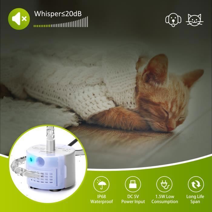 Option de rangement pratique : avec sa structure légère et compacte, cette fontaine à eau pour chat offre un rangement facile, vous permettant de la placer là où elle convient le mieux à vos besoins Performance de pompe silencieuse : conçue avec un moteur avancé à faible bruit, cette fontaine à eau pour chat fonctionne en dessous de 25 décibels, offrant un espace de repos serein et non perturbé pour les chats et améliorant la tranquillité de la maison Solution d'énergie portable : conçue pour plus de commodité, la pompe à eau pour chat fonctionne sur un système basse tension de 5 V, ce qui lui permet de se connecter à une banque d'alimentation ou à un ordinateur pour une performance sûre, économe en énergie et adaptable n'importe où Pompe Circulation Eau économique Fontaine à Eau Pour Chat - Ultra Silencieuse - 1,5 L - Fontaine à Eau Pompe Fontaine Chat Silencieuse Avec la pompe de rechange AniOne pour fontaine à eau, vous êtes bien alimenté à tout moment pour garantir à vos animaux domestiques une expérience de consommation maximale Les mini-pompes à eau de la série WP-ZS sont équipées de ventouses pour une installation facile dans le réservoir d'eau. Elles bénéficient de multiples technologies brevetées, d'une structure compacte, d'un débit et d'une pression d'eau stables, ainsi que d'un faible niveau sonore fontaine a eau pour chat automatique et connectée - PETKIT