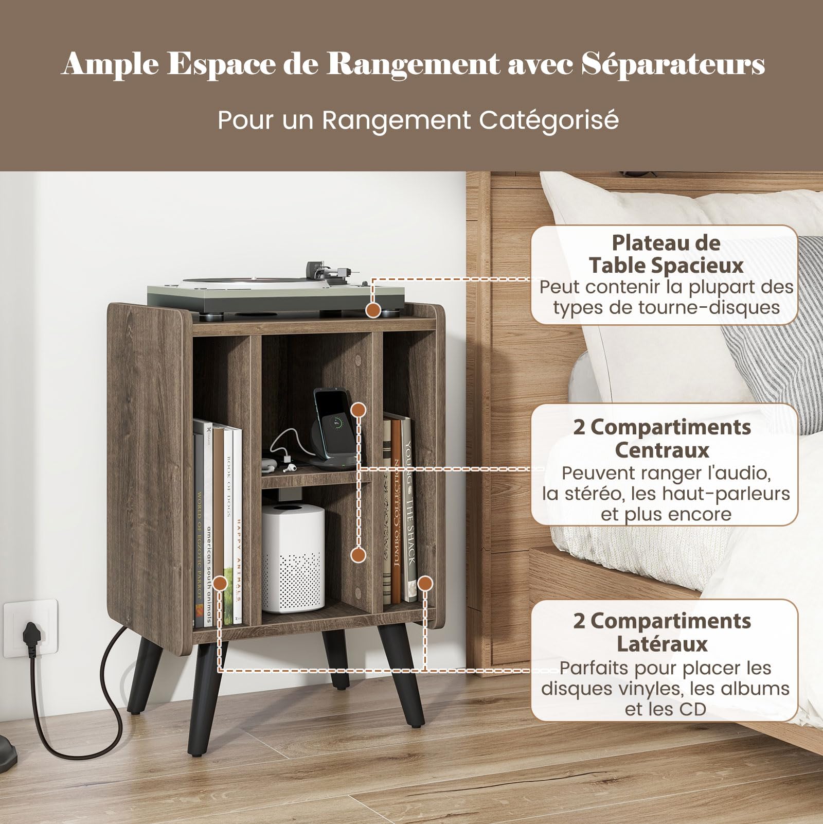 Le tissu Oxford est résistant à la déchirure et durable et conserve sa structure même en cas de forte sollicitation. L'étagère est fabriquée en panneau de fibres de haute qualité et soutenue par un cadre en acier robuste qui allie durabilité et design moderne. Cadre en acier épais. Le tissu Oxford épais assure une grande capacité de charge et le cadre en acier robuste assure un design stable et robuste. Et grâce à son montage facile, votre coin musical est prêt à l'emploi en un tour de main. Yollber Support de rangeent à 2 niveaux pour disques vinyles en étal noir - Peut contenir Spécification : Dimensions : 123 x 30 x 73 cm. Grande capacité : l'étagère pour disques vinyle peut contenir jusqu'à 200 vinyles, avec des étagères spacieuses à 3 niveaux et 2 supports d'affichage en vinyle pour une organisation et un accès faciles à votre collection. Modulivre extension rangement disques vinyles Table de fin avec porte-disque, Support pour tourne-disque avec station de recharge, 2 Table de tourne-disque avec stockage jusqu'à 100 albums, Support pour platine vinyle, Salon, Brun rustique – Meubles HOOBRO pour Le cadre en acier renforcé est fabriqué en métal haute densité et offre stabilité et résistance. Le tissu Oxford épais est non seulement esthétique, mais aussi très résistant. Le support unique pour tourne-disque à 3 niveaux accueille facilement vos trésors musicaux, vous permettant de maximiser votre espace de stockage tout en mettant en valeur votre collection Grâce à la disposition claire et aux étagères facilement accessibles, votre collection reste bien exposée et bien présentée. Équipé de patins pour protéger vos sols des rayures et assurer la stabilité sur les surfaces inégales. Description: Élégante, spacieuse et durable, la solution parfaite pour ranger les vinyles. Fonctionnalité polyvalente : cette étagère multifonctionnelle est parfaite pour ranger les platines, haut-parleurs, livres, magazines, albums photo et vinyles, ce qui en fait un ajout idéal à tout amateur de musique.
