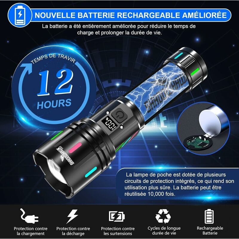 LAMPE TORCHE LED Ultra Puissante Ledeak Cree XM-T6 1000 Lumens Lampe de 2 Interrupteurs & 9 Modes: Cette lampe de poche LED ultra puissante propose 9 modes: Interrupteur supérieur (Lumière principale) : Élevé, Moyen, Faible, Stroboscopique, appui prolongé pour UV 395 nm; Interrupteur inférieur (Éclairage latéral COB) : Élevé, Faible, Mode arc-en-ciel séquentiel, Mode clignotement rouge. Au quotidien ou en situation d'urgence, vous pouvez utiliser la lampe torche LED de manière efficace. Le cordon de la lampe torche tactique peut être porté au poignet ou fixé à l'équipement, empêchant toute chute accidentelle lors de la course, de l'escalade ou en situation d'urgence, tout en garantissant un accès immédiat. La lampe de poche rechargeable est équipée d'une puce intelligente de protection de charge qui offre une protection contre les surcharges, les décharges profondes, les courts-circuits et le contrôle de température. Lampe de Poche - OLOKDYIZ - 1000 Lumens - Rechargeable - 400 m portée... 395 NM UV LAMPE DE POCHE Tous les composants sont rigoureusement testés pour garantir des performances premium. Vous recevez un kit complet incluant: 1× Lampe Torche Ultra Puissante Relybo FP110; 1× Boîte cadeau; 1× Lanyard;1× Câble de charge USB-C; 1× Manuel d'utilisation. Lorsque l'obscurité imprévue s'installe – que ce soit lors d'aventures en plein air à cause d'un brouillard soudain ou lors de pannes de courant inattendues dans la vie quotidienne – vous n'avez pas seulement besoin d'un rayon de lumière, mais d'un partenaire fiable en qui vous pouvez avoir confiance. 【RECHARGEABLE & AFFICHEUR LCD】 Cette lampe torche rechargeable est équipée d'une puce intelligente de protection de charge qui offre une protection contre les surcharges, les décharges profondes, les courts-circuits et le contrôle de température. (Un appui prolongé sur l'interrupteur supérieur permet de commuter entre la lumière LED et le mode UV 395 nm., ) Ainsi, cette lampe torche puissante rechargeable n'est pas seulement une source de lumière, mais aussi un outil polyvalent et un partenaire fiable pour toutes les situations de la vie – que ce soit au travail, lors d'aventures en plein air ou en situation d'urgence. KIT LAMPE TORCHE LED RELYBO FP110 La lampe torche LED ultra puissante rechargeable Relybo FP110 vous offre un éclairage fiable et une sécurité à chaque aventure et à chaque utilisation. L'aimant ultra puissant adhère à n'importe quelle surface métallique. 【3 SYSTÈMES DE FIXATION】 Votre torche n'est pas seulement une source de lumière, mais un assistant indispensable! 1 ÉTANCHE IPX6 2 MAGNÉTIQUE ULTRA 3 PORTE-CLÉS 4 CLIP ARRIÈRE RENFORCÉ Elle dispose d'une lampe UV de 395 nm, conçue spécialement pour les inspections – un simple appui prolongé sur le bouton supérieur permet de basculer instantanément entre la lumière LED blanche et la lumière UV. 1 LED & UV 2 EN 1 2 COB LATÉRAL 3 2 INTERRUPTEURS 4 COMPACT ET LÉGER 5 BATTERIE RECHARGEABLE Torche UV 395nm Rechargeable USB-C Relybo Lampe Torche LED Ultra Puissante, 1000000 Lumens Lampe Torche LED Puissante Rechargeable USB, XHQ100 Lampe Torche Tactique Militaire Pour Camping Urgence Cob Led 【2 INTERRUPTEURS & 9 MODES】 Cette lampe torche puissante propose 9 modes : Interrupteur supérieur (lumière principale) : Elevé, Moyen, Faible, Stroboscopique, appui long pour UV 395 nm ; Interrupteur inférieur (éclairage latéral COB) : Elevé, Faible, Mode arc-en-ciel séquentiel, Mode Stroboscopique Rouge. Un appui prolongé sur l'interrupteur supérieur commute entre la lumière LED et le mode UV 395 nm. Comparez et évaluez les 10 meilleurs Relybo Lampe Torche Led Ultra Puissante pour 2025 sur . Découvrez les options les mieux notées avec des analyses détaillées pour vous aider à faire le meilleur choix Avec 9 modes intelligemment conçus, la lampe de poche puissante Relybo FP110 s'adapte à tous les scénarios – du quotidien aux situations d'urgence.
