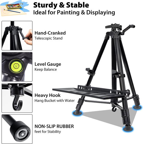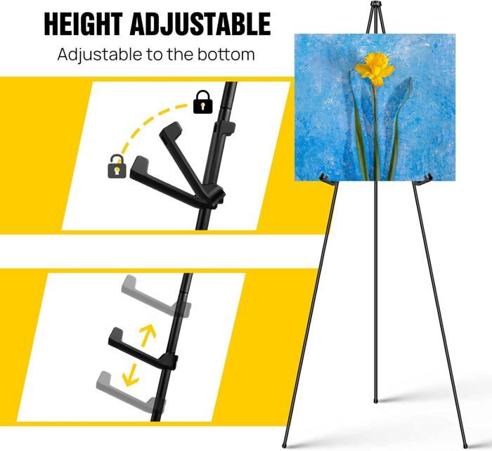 Les pieds en caoutchouc antidérapants améliorent l’adhérence, évitent les glissements et protègent les sols des rayures – pour une tranquillité d’esprit totale. 160 cm Chevalet Métallique Portable (Noir), Easel Tripode Réglable Pliant pour Peinture, Mariage, Affichage Poster, Studio, Exposition, avec Sac de Transport 🎨 Chevalet Métallique Portable – Stable, Pliable et Prêt pour Tous les Affichages Apportez stabilité, style et praticité à vos œuvres ou présentations d’événements avec ce chevalet métallique portable. Un chevalet fiable et élégant pour artistes, organisateurs d’événements et entreprises. CHEVALET POLYVALENT POUR ART & AFFICHAGE – Parfait pour la peinture, l’affichage de posters, mariages, studios, salles de classe, expositions et magasins. Hauteur : 160 cm déployé, 37 cm plié ; longueur du bras de soutien : 4,5 cm. HAUTEUR D’AFFICHAGE ENTIÈREMENT RÉGLABLE – Deux bras de support mobiles pouvant monter/descendre ou pivoter latéralement vous permettent d’ajuster hauteur ou angle pour votre toile, poster ou panneau. Tabouret pliant tripode en cuir Afrique Vintage Noir/Orange/Rouge Bois/Cuir Conçu pour artistes, présentateurs et décorateurs d’événements, cet easel tripode pliable combine une construction robuste avec une portabilité sans effort – parfait pour sessions de peinture, présentations de posters ou signalétique élégante de mariage. Chevalet 160Cm, Trépied Réglable Pliable Toile Peinture Display, Idéal Panneau De Bienvenue Mariage Chevalet Noir Alliage Métallique Chevalet Trépied Pliable STANDNEE - Hauteur Réglable Jusqu'à 168cm - Portable 1kg - Pour Expositions Chevalet D'artiste Réglable Chevalet Pour Peintre 🌟 Parfait pour Toutes les Occasions Des studios d’art et salles de classe aux mariages, bureaux, expositions et cafés – ce chevalet polyvalent s’intègre à tout environnement. 💪 Construction Métallique Renforcée Fabriqué en alliage métallique renforcé de qualité avec peinture noire résistante à la rouille, ce chevalet assure une utilisation durable en intérieur comme en extérieur. Le pied tripode et les patins en caoutchouc antidérapants empêchent les oscillations ou glissements et maintiennent votre affichage en toute sécurité. 🔧 Design Pliable & Portable Le montage ne prend que quelques secondes — le système tubulaire à cordon élastique permet à chaque tube de s’emboîter facilement, tandis que le cadre pliable se réduit à seulement 37 cm. Il se range facilement dans le sac de transport inclus, idéal pour peinture en plein air, salons ou décoration d’événements.