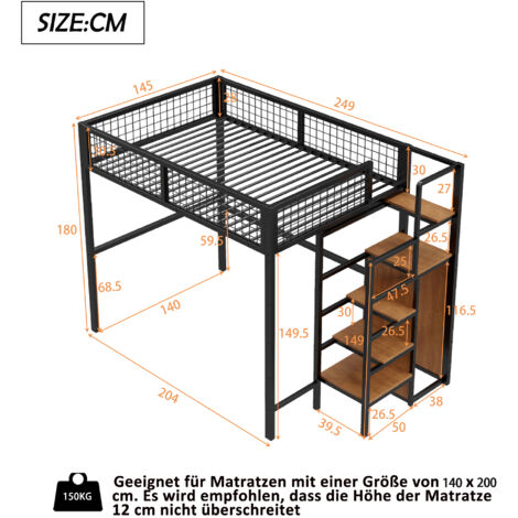 Nombre de colis : 2 Poids total du produit : 47 kg. Le lit inférieur est équipé d'une porte rabattable, créant ainsi un espace ludique et polyvalent qui peut être utilisé pour se détendre, lire, jouer ou se divertir, ce qui en fait un complément multifonctionnel pour toute chambre à coucher. Ce lit superposé est constitué d'une structure métallique robuste, durable et au look moderne et élégant. Disponible en blanc ou en noir, il s'intègre parfaitement aux styles d'ameublement modernes, classiques ou ludiques des chambres à coucher. Une échelle avant pratique permet d'accéder directement et en toute sécurité au lit supérieur. Lit Robuste Rangement Jeu Lit Mezzanine En Métal, 140 × 200 Cm, Avec Escalier Et Armoire, Lit D'enfant, En Fer, Avec Protection Anti-chute, Compartiment De Rangement Et Grille En Fer Pour Enfants, Adolescents Ou Adultes, Noir Lit Mezzanine 160x200 Matériau du produit : métal Poids total du colis : 51 kg Nombre de lattes : 20 Temps d'assemblage estimé : 2 heures Nombre de personnes recommandé : 2 Outils supplémentaires requis : tous les outils sont inclus/tournevis Évitez les outils électriques : oui. 【Barrières de sécurité sur tout le pourtour】 – Ce lit en métal est équipé de barrières de sécurité sur tous les côtés des lits supérieur et inférieur, pour que vous puissiez dormir tranquille. Le choix entre une finition blanche ou noire permet au lit de s'intégrer parfaitement à différents styles de chambres, du style ludique et moderne au style minimaliste et élégant. La partie inférieure peut être utilisée comme espace de détente ou de loisirs et dispose d'une petite porte qui s'ouvre et se ferme, pour plus de plaisir et de confort. Étage supérieur et inférieur multifonction - Le lit combine un couchage en hauteur et un espace inférieur modulable pour lecture, repos ou jeu, maximisant l’utilisation de l’espace et enrichissant l’expérience de la chambre Il est à la fois ludique et pratique. Poids et dimensions : Dimensions totales du produit : 204 x 145 x 201,5 cm. 【Cadre unique en forme de maison】 – Ce lit superposé en métal présente un design ludique en forme de maison et crée un espace de sommeil plein d'enfance et d'imagination. Il est disponible en deux tailles pratiques (90x200cm et 140x200cm) et convient aux enfants en pleine croissance, aux adolescents et même aux petites familles. Structure à garde-corps haut] – Ce lit superposé est certifié EN747 et doté d'un garde-corps haut pour éviter les chutes. Il convient aux enfants de 6 ans et plus OOIILLEE Lit Mezzanine 2 Place avec LED, Lit Enfant avec Rangement et d'une Armoire Ouverte, Lit Superposé Enfant 140x200 avec échelle et Balustrade, Lit superposé en Fer métal Blanc(sans Matelas Capacité de poids : 120 kg.