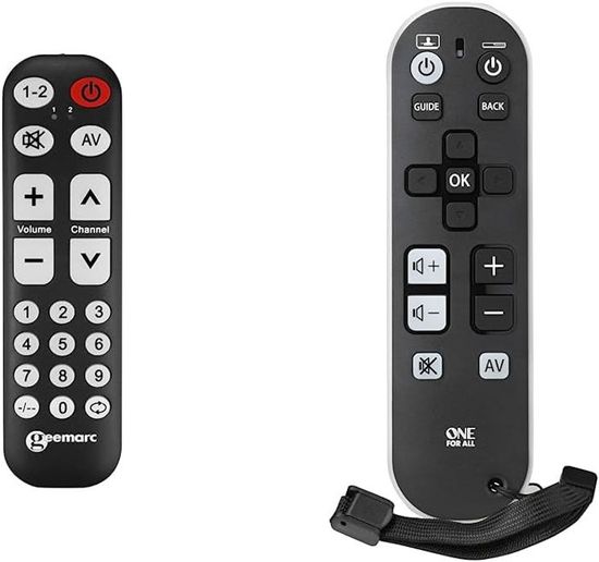 ✔️ COMPATIBILITÉ - Cette télécommande peut rester appairée à 2 appareils différents simultanément. Geemarc TV-10 Universel Télécommande noir Télécommande Geemarc TV10 Universelle pour la Télévision ✔️ LARGES BOUTONS - Avec ses grosses touches programmables, la TV10 est parfaite pour les personnes âgées qui ne sont pas très à l’aise avec les nouvelles technologies et éprouvent des difficultés à utiliser une télécommande ayant des dizaines de petits boutons. ✔️ TÉLÉCOMMANDE D’ORIGINE REQUISE POUR L’APPAIRAGE. Télécommande grosse touche universelle TV10 Geemarc Elle est ergonomique et vous pouvez atteindre chacun de ses boutons uniquement avec votre pouce. Description du produit Télécommande universelle très simple d'utilisation avec des grosses touches et un clavier numérique Possibilité de gérer deux appareils ( TV décodeur ) Contenu du coffret Télécommande, Notice Telecommande Universelle Senior Geemarc TV10 - Télécommande Universelle Facile D'Utilisation Avec 19 Gros Boutons Programmables Pour Séniors - Télécommande D'Origine Requise Pour Appairage - Fonctionne En Infrarouge Telecommande Senior