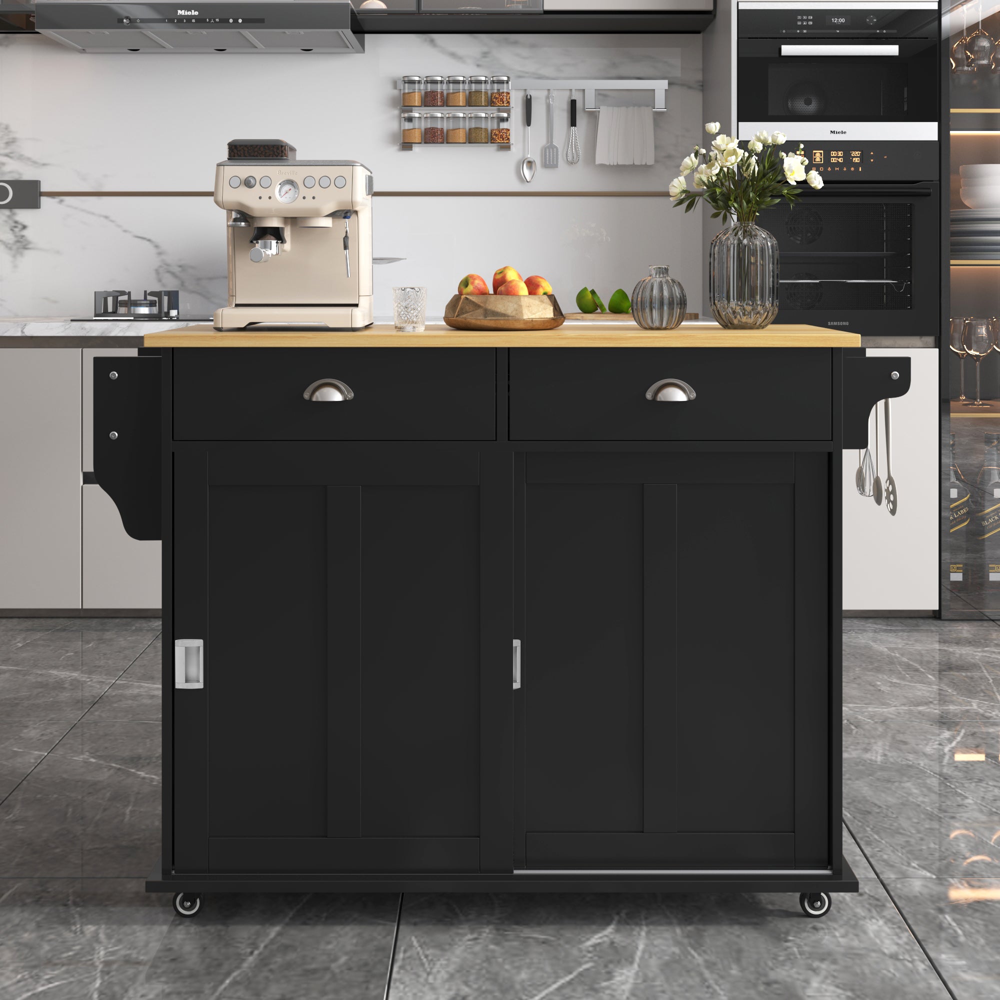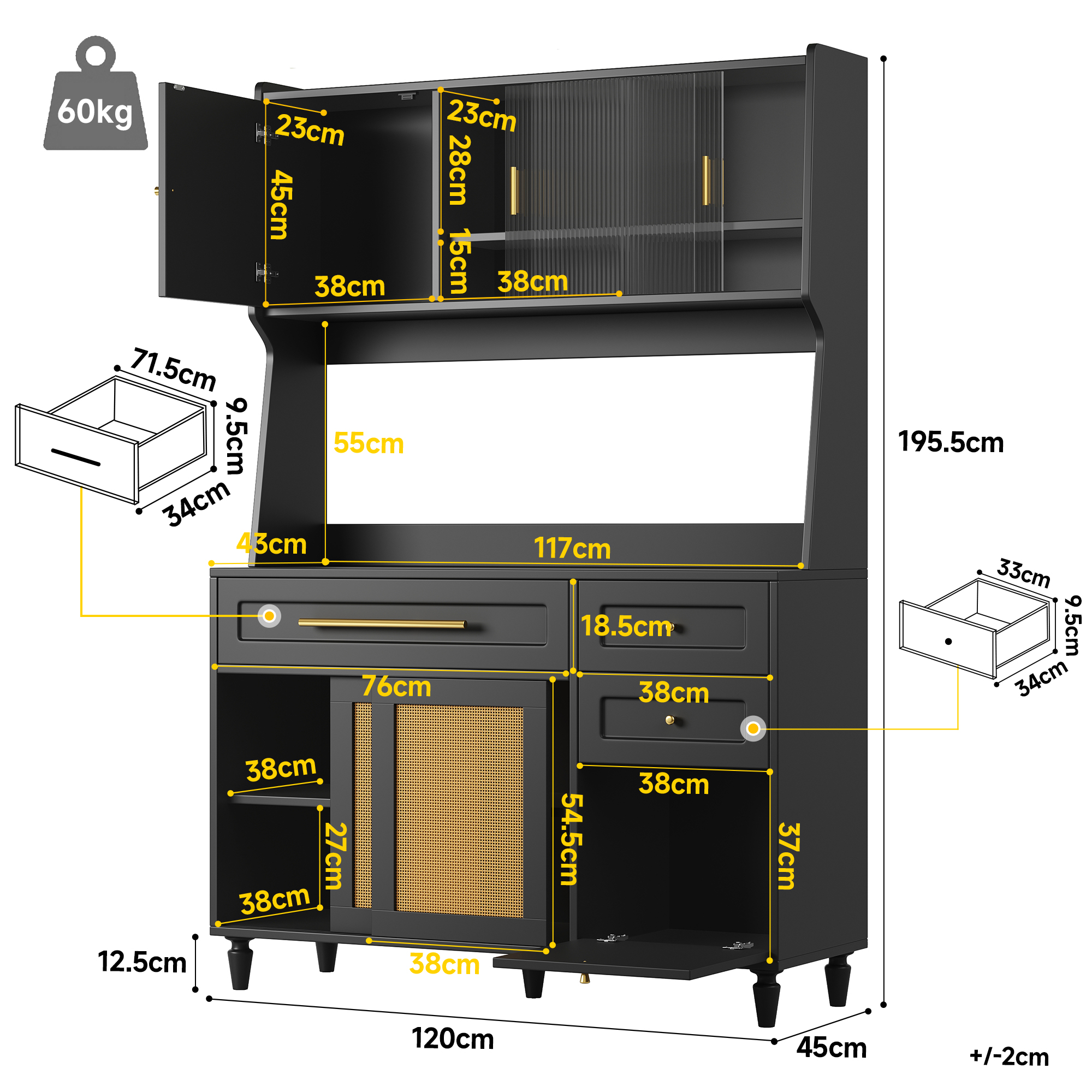 Buffet, armoire de cuisine avec 2 portes, 3 tiroirs et porte-serviettes Buffet Noir Design Moderne Seyakany Buffet Avec étagères Réglables, 120x40x180cm, Meuble Meuble Anti-basculement Sécurisé Armoire polyvalente : cette armoire est polyvalente et peut être placée dans différentes pièces de la maison, telles que le salon, la chambre à coucher, la cuisine, le couloir, l'entrée ou le bureau. Design raffiné et matériaux de haute qualité : fabriqué à partir de panneaux MDF et PB de haute qualité, avec d'élégantes portes coulissantes en verre et des poignées en aluminium, des détails soigneusement élaborés qui s'intègrent parfaitement dans les intérieurs modernes. Espace de rangement pratique : cette armoire haute dispose de deux tiroirs de grande capacité et d'un espace intérieur avec des étagères réglables, dans lequel vous pouvez facilement ranger des objets de différentes tailles. Construction robuste: La commode a été conçue pour être un meuble durable car elle a été fabriquée à partir de matériaux en bois de haute qualité et d'un excellent rail, le tout pour une utilisation confortable Le large plan de travail offre beaucoup d'espace pour les appareils de cuisine, vous permettant de dire adieu au désordre dans votre cuisine et d'atteindre facilement l'état idéal d'un rangement bien organisé. DESIGN ÉLÉGANT - La palette de couleurs contemporaines blanc et or crée un look luxueux ; les façades brillantes des 6 tiroirs se coordonnent avec les poignées dorées et les pieds fins Particulièrement adaptée aux familles avec des enfants ou des animaux domestiques, elle vous permet de garantir la sécurité et la tranquillité d'esprit à la maison lorsque vous êtes occupé dans la cuisine. Commande d'éclairage LED multifonctionnelle : prise en charge d'une application mobile pour contrôler les lumières LED, changement facile de plusieurs couleurs pour créer une atmosphère personnelle de lumière et d'ombre.