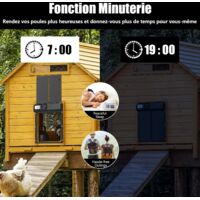 Installation Facile: Cet porte poulailler automatique ne nécessite aucun outil complexe pour son installation, et les étapes d'installation sont très simples; Cet porte automatique poulailler peut être utilisé pour divers types de volailles, et sa grande taille permet aux volailles de passer facilement à travers Description du produit Fexrror Porte Poulailler Automatique Solaire avec Écran LCD Étanche 3 Modes: L'porte pour poulailler automatique offre 3 modes (minuterie, manuel, télécommande) pour s'adapter à différents horaires et besoins des volailles; L'porte automatique pour poulailler est équipé d'un écran d'affichage, ce qui simplifie son utilisation et ses réglages; Vous pouvez surveiller les réglages et le niveau de la batterie à tout moment via l'écran d'affichage Porte Automatique Pour Poulailler - Trappe étanche En Aluminium Avec Ecran Lcd Ouverture Programmable 96912374 Matériaux de Haute Qualité: L'porte de poulailler automatique solaire est fabriqué en alliage d'aluminium durable, garantissant résistance et fiabilité; Sa conception robuste permet également de dissuader les prédateurs tels que les coyotes, les renards et les serpents; L'trappe poulailler automatique est étanche, empêchant l'eau de pluie de s'infiltrer Découvrez la porte automatique de poulailler solaire avec écran LCD pour un réglage facile. Sécurité, praticité et durabilité sont au rendez-vous avec ses 4 modes d'utilisation, sa conception anti-pincement et son étanchéité IP44. Fabriquée en aluminium et acier allié, elle résiste à tous les temps. Cliquez maintenant Alimentation Solaire Batterie Porte Poulailler Automatique Solaire, Porte Automatique Leroy Merlin Marque. PYOCRD ; Dimensions du produit. 27,5L x 4,5l x 36,2H centimètres ; Matériau. ABS alliage d'aluminium ; Usages spécifiques pour le produit. Extérieur...