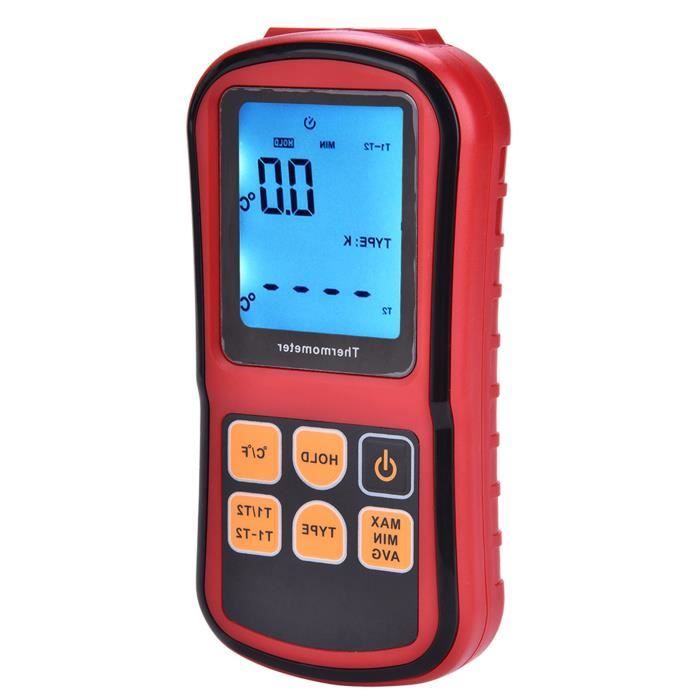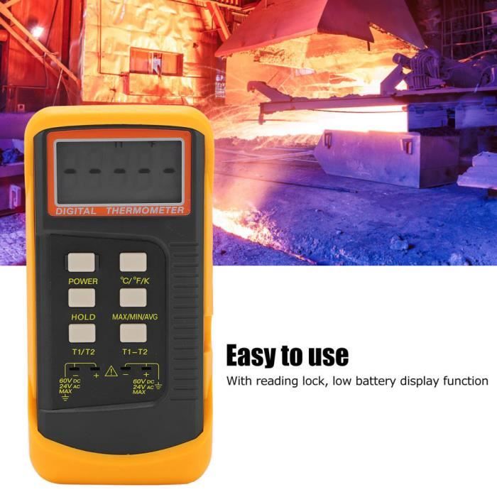 Thermomètre Digital JUSTOOL Thermomètre à Double Canal avec 2 Thermomètre Portable Batterie Aaa Thermometre Laser Thermomètre Numérique Double Canal Avec 2 Thermocouples K - Plage -50°C à 300°C Thermometre Avec Sonde Thermomètre Portable Précis Petite taille, facile à transporter et à ranger, pratique à utiliser et avec de bonnes performances. 1., Largement utilisé dans les réservoirs de poissons, piscines, fours, céramiques, fondants métalliques, 2., La technologie d'affichage haute définition douce LED, le gris n'est pas éblouissant, visible la nuit en haute résolution., 3., Le thermomètre avec fonction de conversion vous permet de basculer entre Celsius ou Fahrenheit., 4., Thermomètre numérique avec protection d'entrée, entrée de tension maximale 30VDC ou 24VAC., 5., Petite taille, facile à transporter et à ranger, pratique à utiliser et avec de bonnes performances. Thermomètre numérique avec protection d'entrée, entrée de tension maximale 30VDC ou 24VAC. Thermomètre numérique DT6802 double canal pour la maison intérieure et extérieure - Jardin Le thermomètre avec fonction de conversion, vous pouvez basculer entre Celsius ou Fahrenheit. Thermomètre à thermocouple multifonctionnel]Large plage de mesure de température : -200 °C à 1370 °C (-328 °F à 2498 °F). Outre les fonctions de lecture maximale, minimale et moyenne, de maintien des données et d’arrêt automatique, cet appareil dispose de deux entrées permettant l’affichage des températures T1 et T2, ainsi que de la différence entre ces deux... Largement utilisé dans les aquariums, piscines, fours, céramiques, fondus métalliques, etc. Spécification: Type d'objet: Compteur de température numérique Modèle: HS6802 Matériau : ABS Affichage: Écran LCD à double rangée 3-1/2 chiffres, la lecture maximale est 1999 Protection d'entrée: 30VDC ou 24VAC entrée de tension maximale Température de fonctionnement: 0~50 ℃ Précision de mesure: -50 ℃~1000 ℃+ (0,3%rdg+1℃) 1001℃~1350℃+(0,5%rdg+1℃)Nombre de canaux d'entrée: Double canaux Plage de mesure: -50℃~1350℃ (-58 ~1999 °C) Taux d'échantillonnage: 2,5 fois/sec.