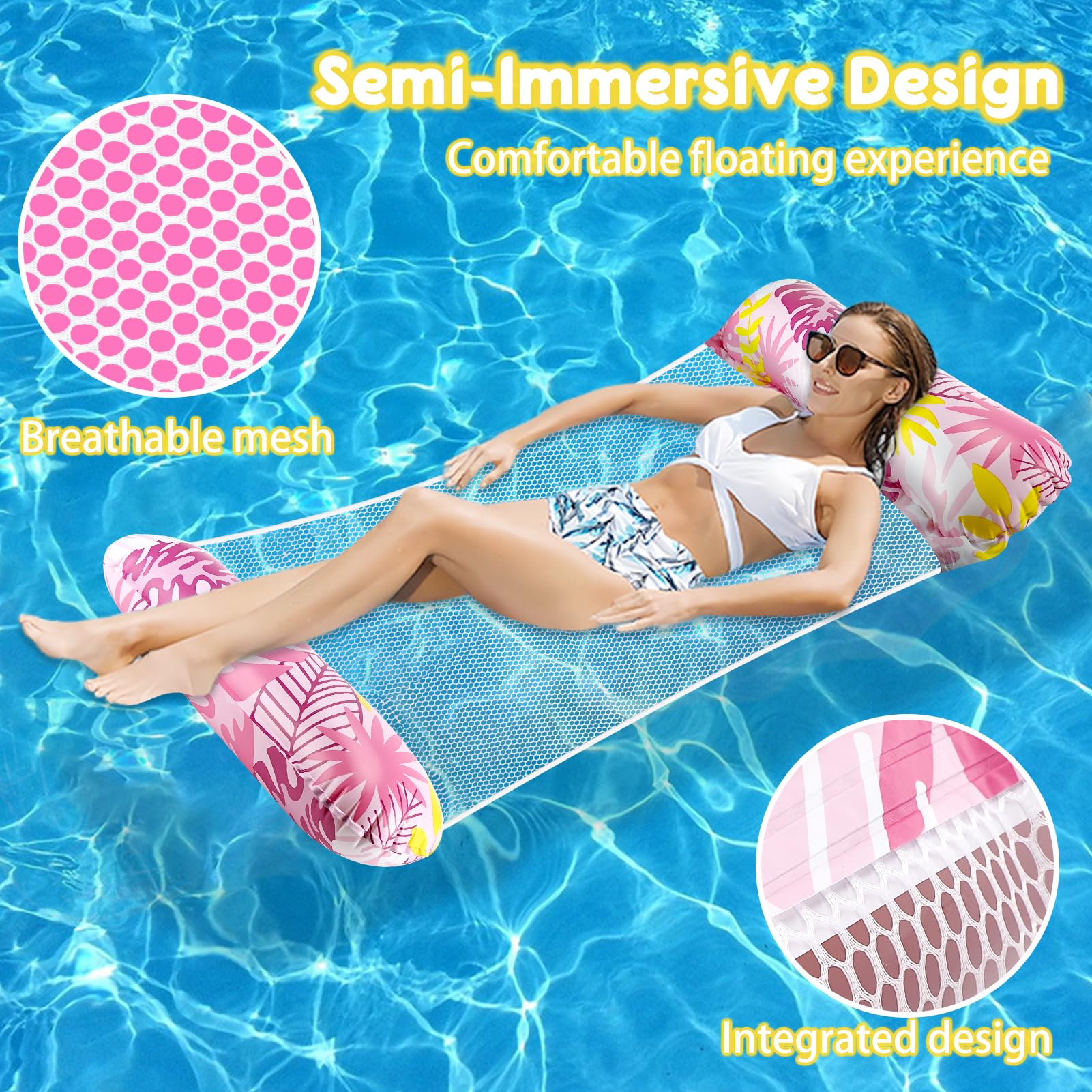 Concept du Produit: Le matelas piscine gonflable adopte un design semi-immergé pour vous permettre de flotter à la surface de l'eau dans une position naturelle. CHUNLINLAODA Lot de 2 hamac pour Matelas gonflables pour Piscine Pompe à air Manuelle Adultes et Enfants hamac à Eau Motif rayé hamac Flottant Pool Party Vacances à la Plage (Bleu foncé Bleu Clair Que ce soit pour une sieste sur l'eau ou un bain de soleil, il offre une expérience de confort ultime Confort Ergonomique: La combinaison de la maille respirante et du matelas gonflable élastique crée une expérience de flottaison semi-immersive. Solidité et Capacité de Charge: Grâce à sa conception mécanique innovante, le flottant hamac gonflable supporte jusqu'à 100 kg, offrant une stabilité inégalée pour adultes et adolescents. Piscine Bouee Hamac Gonflable MRETERNEL Piscine, Hamac D'eau, Hamac De Piscine Gonflable Avec Filet Hamac Flottant Gonflables De Piscine Matelas D Eau Pour Adultes 110 X 58848 B Matelas Gonflable Eau Matériaux de Qualité: Le matelas piscine gonflable est fabriqué en PVC haute densité et en maille 3D respirante. Le hamac de piscine offre à la fois la douce portance de l'eau et une stabilité optimale. Son système de support ergonomique épouse parfaitement les courbes du cou, du dos et des lombaires pour un confort prolongé Le PVC offre une étanchéité exceptionnelle pour une flottaison prolongée sans fuite. 2 Pièces Hamac Flottant Piscine, 4 En 1 Multi Usage Hamac Gonflable Piscine Avec Maille Fauteuil Gonflable Pour Adultes Et Enfants Portable Flottantes Hamac Lit Pour Voyage Piscine 71761263 Une pompe à gonflage manuelle est incluse pour un gonflage rapide, et il se range facilement après utilisation Ensemble de piscine gonflable : Cet ensemble comprend deux matelas gonflables. C'est un excellent choix pour profiter pleinement de la piscine.Quatre fonctions : conception quatre en un, transformable en hamac, selle de sport, chaise de loisirs ou chaise de rafting