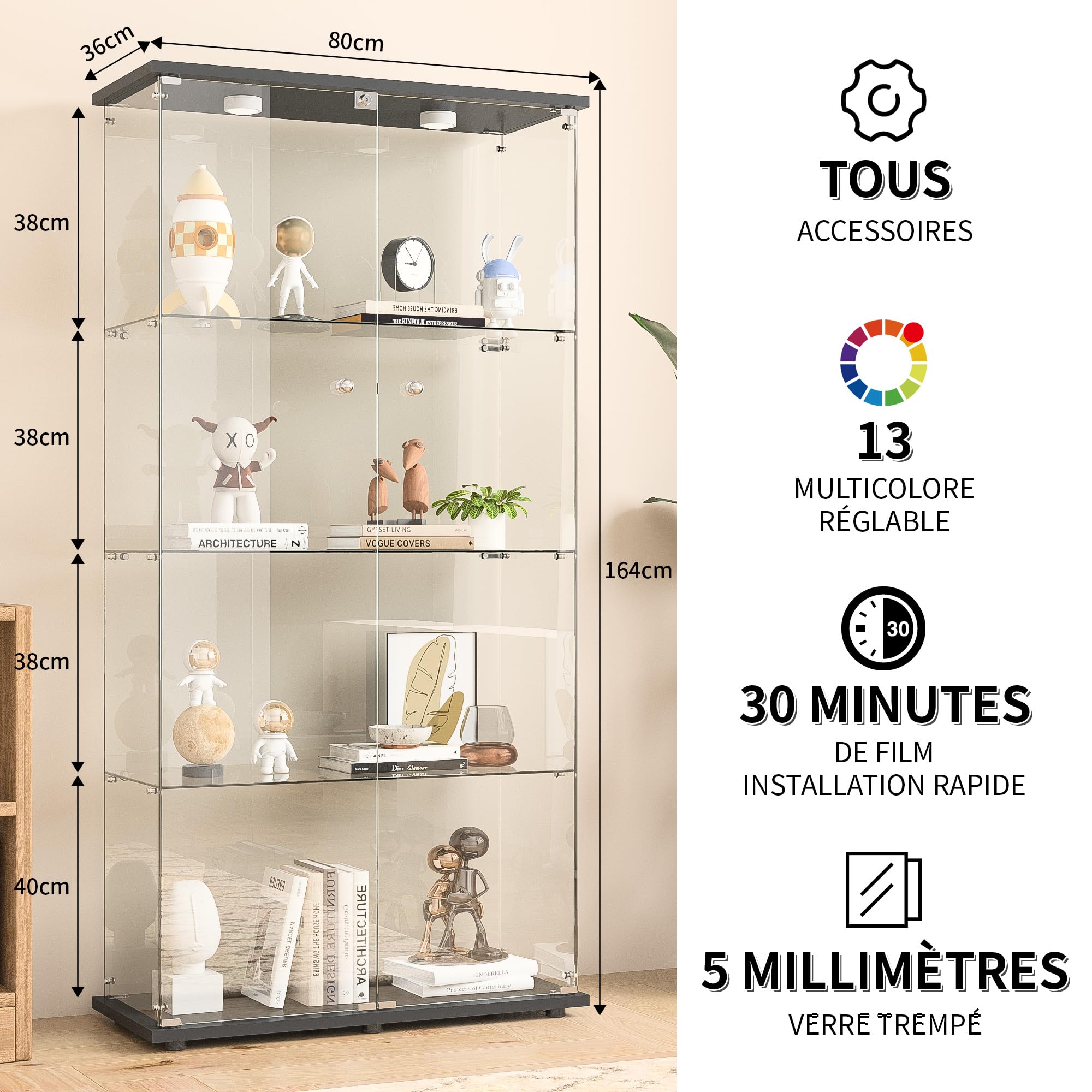 Entre la vitre en verre et les côtés se trouve une barre de choc pour maximiser la sécurité, la durabilité et la facilité d'utilisation quotidienne. Vitrine en Verre avec Led, Armoire de Collection Moderne en Verre à Quatre Couches avec 2 Portes, Verre trempé Transparent Vitrine de Collection , Salon et Salle à Manger (Avec éclairage, Noir La plaque de base antidérapante peut être réglée en hauteur pour s'adapter à différentes conditions de sol. 【Installation Rapide et Sûre】Améliorée pour un assemblage facile : guide clair, toutes pièces incluses, aucun savoir-faire requis. Ses dimensions généreuses s'adaptent à divers objets, des livres aux petits bibelots et grands décors. Le design minimaliste réduit l'encombrement visuel, permettant à vos collections de prendre le centre stage sans compromettre la protection. 【Polyvalence Multi-Pièces】Parfaite comme étagère à livres, dans le salon (expositions de collections), la chambre (rangement de bijoux ou objets décoratifs) ou le bureau (organisation de documents et accessoires). rangement en verre trempé de 5 mm pour salon, chambre à coucher et bureau. 589,99 $ était639,99 $. Ajouter au panier. Vitrine 2 portes Led La vitrine est équipée de deux étagères robustes en verre de sécurité trempé, qui garantissent la stabilité et une vue claire de vos objets préférés. Vitrine Murale Pour Collection Vitrine En Verre Avec 4 étagères, Vitrine Une Porte, Avec éclairage Vitrine Pour Collection Murale Meuble Vitrine Verre Meuble Vitrine En Verre,Vitrine En Verre 4 Couches, vitrine En Verre Pour Salon,Transparent Armoir De Verre Avec 2 Porte Et Serrure,vitrine De Collection, Noir Vitrine Verre Vitrine Led En combinaison avec ses panneaux en bois massif imperméables et faciles à nettoyer, notre vitrine est une solution de présentation et de rangement de qualité supérieure Achetez une vitrine en verre et faites briller vos découvertes !, ATTENTION : 1., Pour éviter qu'elle ne bascule, elle doit être fixée au mur à l'aide du support fourni. 【Stable et Durable : Sécurité Maximale】Fabriquée en verre de sécurité trempé 5 mm anti-explosion et anti-casse, notre vitrine intègre une barre de choc entre la vitre et les côtés pour renforcer la résistance quotidienne. Associée à des panneaux de bois massif imperméables et faciles à nettoyer, elle garantit une longévité optimale pour protéger vos objets précieux. 【Stable et durable】 : notre vitrine en verre est fabriquée en verre de sécurité trempé de 5 mm d'épaisseur, spécialement traité pour la rendre incassable et anti-explosion.