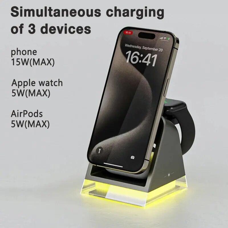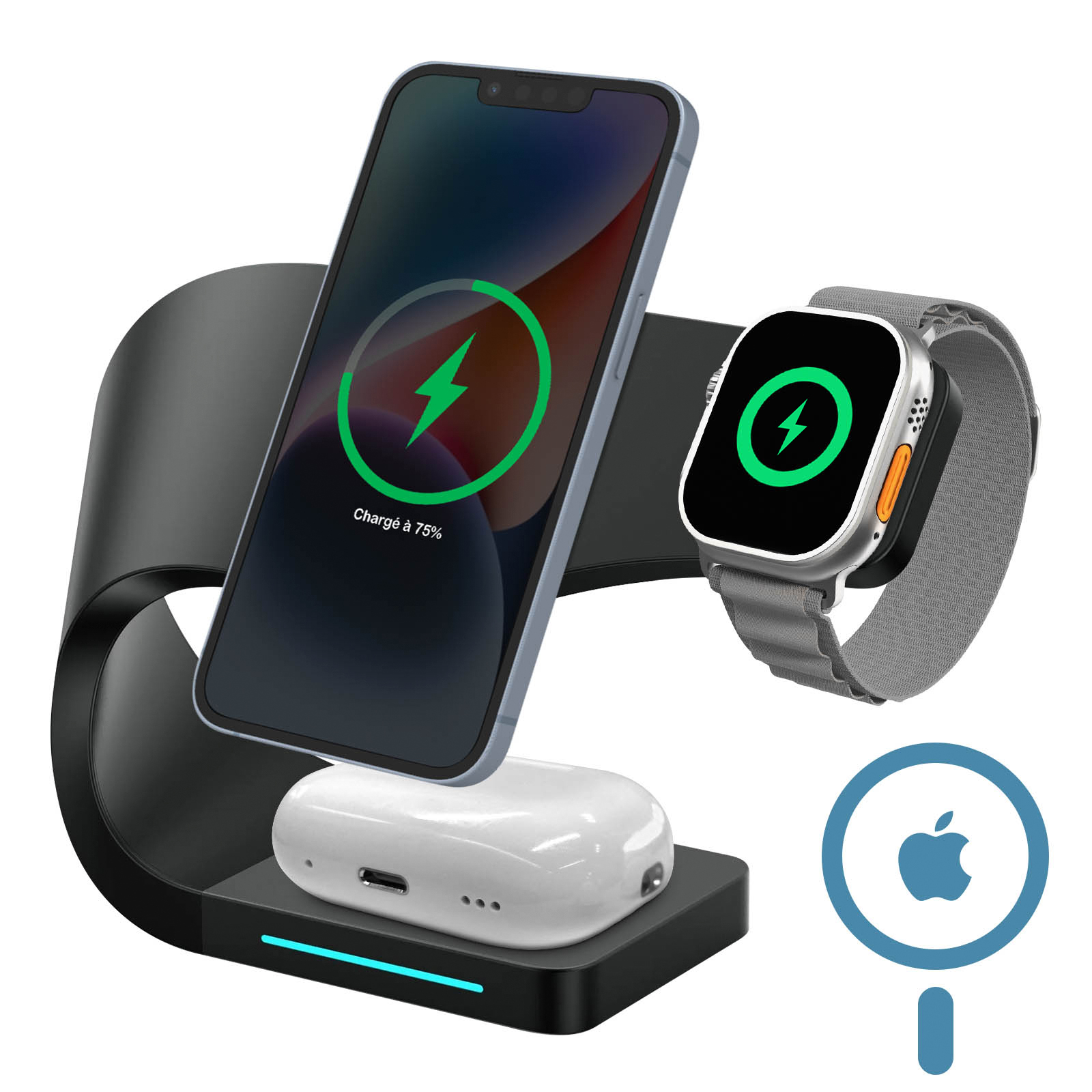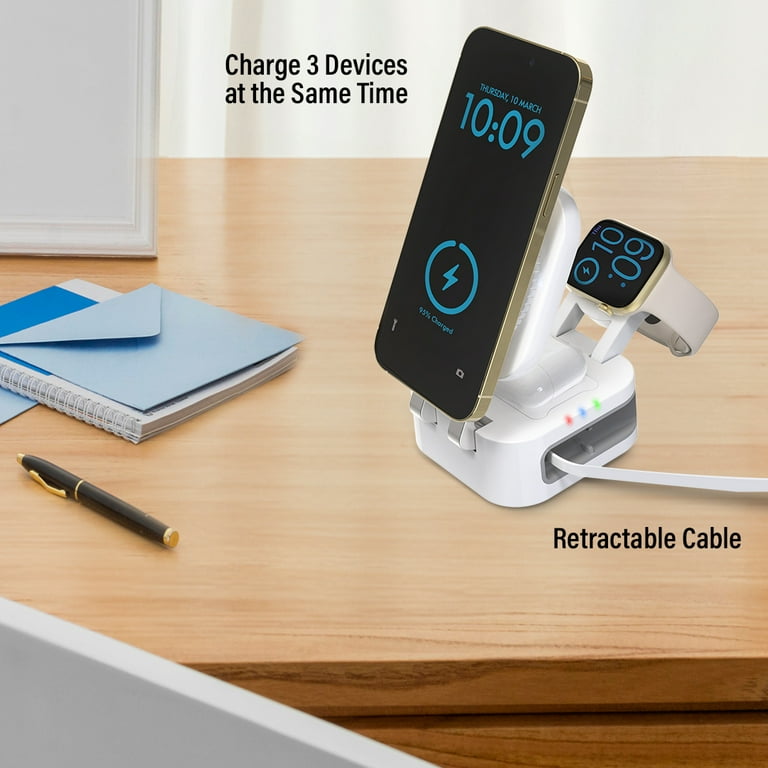 Type de connecteur : USB-A Certification : aucun Produits chimiques particulièrement attentifs : aucun. Station de charge sans fil : station de charge 3 en 1 pour plusieurs appareils, équipée d'un chargeur Apple Watch, d'un chargeur sans fil iPhone, d'un chargeur sans fil Airpods Appareils compatibles : montres connectées. Décoration de bureau de style cybertruck : le design mécanique futuriste transforme votre pièce en un lieu technologiquement avancé et combine fonctionnalité et esthétique époustouflante. Chargeur caché en un clic pour la montre : la base peu encombrante se déplie d'une simple pression et se range proprement lorsqu'elle n'est pas utilisée. Apple Charging Station De Charge Sans Fil 3 - En - 1 Pour IPhone, Apple Watch Et Airpods, Station De Charge Rapide Pivotante De 10W à 360 Degrés - Accessoires Téléphone & Objets Connectés Right In Stride Tri Fold Charging Remarque : La couleur réelle de l'article peut varier légèrement de celle de la photo en fonction des paramètres d'affichage et de luminosité de votre ordinateur. Les voyants LED doux pour les yeux vous informent de l'état de charge de votre appareil peu encombrant. Support magnétique réglable à 90 ° : les aimants puissants maintiennent les appareils en toute sécurité dans la plupart des cas et peuvent être tournés verticalement pour assurer une vision optimale pendant le chargement et avoir les mains libres. Les mesures étant prises à la main, les tailles indiquées peuvent varier de 1 à 2 cm. Station de charge sans fil 3 en 1 avec support magnétique, blanc Contenu de l'emballage : Support de charge sans fil portable pour iPhone, iWatch, AirPods, LED Light et Mini Fun. équence de travail, 100-205KHz. Efficacité de conversion, 80%-85% Max