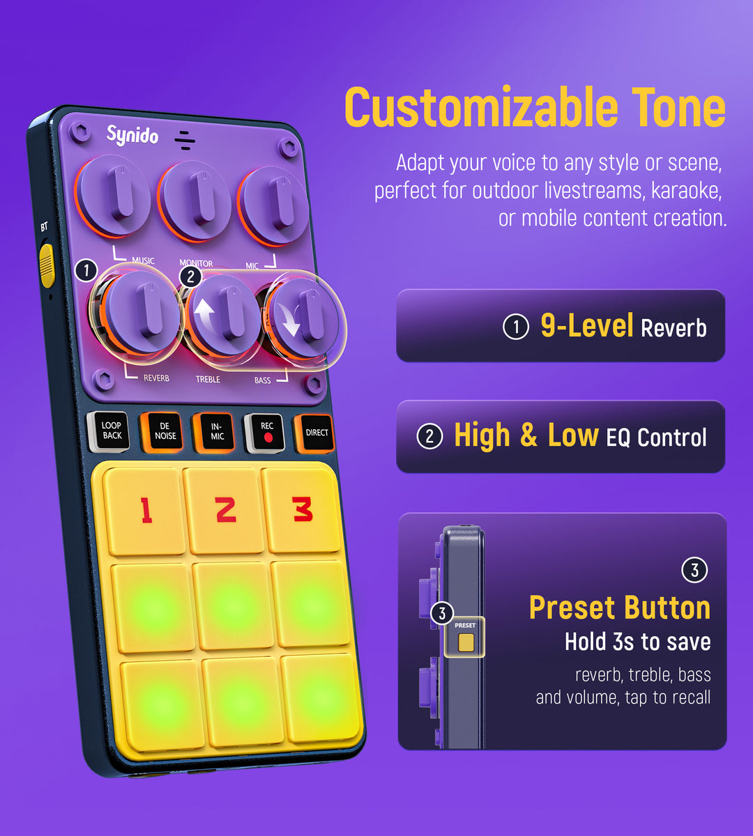 Il est donc compatible avec une grande variété d'instruments, guitares électriques/claviers midi/pianos numériques/basse électrique/batterie électrique., ., . Adaptateur USB-C Instruments Synido Interface Audio Portable Pour Guitare, Adaptateur Sound Card [Compatibilité plus large] Le contrôle adaptatif du gain optimise le son de divers instruments, cette interface audio d'enregistrement de musique peut amplifier les signaux audio, éviter la distorsion, éviter la surcharge du signal. [Enregistrement de musique portable] Interface audio Synido pour l'enregistrement de musique, comme le compagnon d'entraînement ultime pour les amateurs de musique, avec boucle arrière ultra claire et fonction de moniteur. Audio haute fidélité : notre mini interface audio de guitare dispose d'une résolution de qualité studio 24 bits/96 kHz (supérieure aux autres) pour capturer chaque note, accord et nuance de votre performance. L'interface audio Synido pour le direct est une carte son portable et un convertisseur audio, particulièrement adapté aux diffusions en direct sur mobile. Elle est dotée d'une interface USB-C permettant une connexion directe à un téléphone portable ou à un ordinateur La puce double cœur et le système de traitement du son vous permettent de profiter d'une qualité audio impeccable et de dire adieu aux retards et au bruit distrayants Wrugste Interfaz De Audio Usb Solo (24 Bits/96 Khz)+alimenta Le commutateur sans fil à une touche peut être activé pour se connecter à un autre téléphone mobile pour ajouter un accompagnement sans fil Le contrôle unique du gain de l'instrument s'adapte au niveau de sortie des différents instruments pour garantir que chaque instrument peut être enregistré au mieux