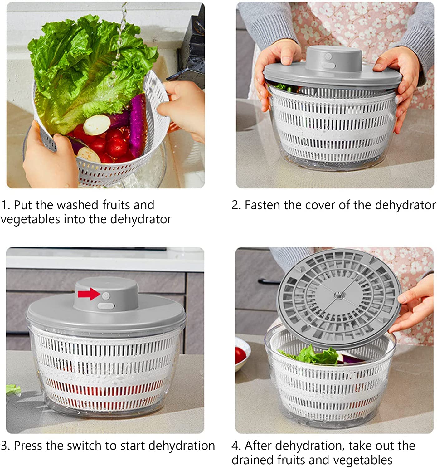 Sans bavures sur les bords, il ne vous fera pas mal aux mains, ce qui rend la préparation des aliments sans effort avec des résultats de haute qualité. Sommaire du produit : Essoreuse à salade électrique à chargement USB - Nettoyeur rotatif pour fruits et légumes - Sans danger pour les aliments - Pour animaux domestiques Caractéristiques Nom : essoreuse à salade électrique., Matériel:ABS Avec la capacité de vider l'eau environ 100 fois par charge, cette essoreuse rechargeable par USB rend la préparation de la salade rapide et facile, peu importe où vous êtes. ✿Simple à utiliser : d'une simple pression sur un bouton, vous pouvez abandonner la solution manuelle et permettre à notre essoreuse à salade électrique de décharger immédiatement l'eau tout en effectuant des tâches motorisées de vidange d'eau et de déshydratation en même temps, ce qui vous facilite la vie. Spécification: Nom : essoreuse à salade électrique. ✿Manger sainement sans effort : notre essoreuse à salade électrique pense à tout. Fini les salades détrempées ! Grâce à son système d'essorage automatique, cette essoreuse vous permet d'obtenir une salade parfaitement essorée et prête à être... Taille du produit: environ 22x1 6 cm/8,66x6,3 pouces , Poids : 900g , Capacité : 3L Essoreuse à salade de 4 L, égouttoir à salade en PP avec Déshydrateur Légumes USB Essoreuse à Salade électrique : Des Salades Sèches En 20 Secondes - Hagen Grote Suisse Essoreuse Légumes Fruits 3l Connectez simplement le câble USB fourni et chargez. Essoreuse à salade électrique, déshydrateur d'essoreuse à salade pour fruits et légumes Manger sainement sans effort notre essoreuse à salade électrique pense à tout. Fabriqué avec un matériau ABS de qualité alimentaire, écologique et sûr. Sa conception sans bords garantit que vos mains ne se blesseront . Simple à utiliser d'une simple pression sur un bouton, vous pouvez abandonner la solution manuelle et permettre à notre essoreuse à salade électrique de décharger immédiatement l'eau tout en effectuant des tâches motorisées de vidange d'eau et de déshydratation en même temps, ce qui vous facilite la vie.