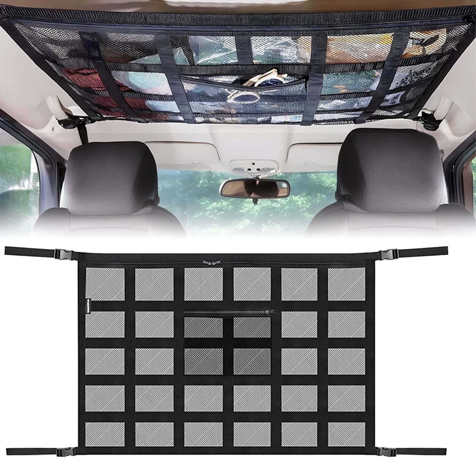 Filet de Rangement pour Voiture - Universel - Noir - Organisateur de Toit - 2 Couches Filet élastique Intérieur Voiture De Voituret, Multifonctionnel Organisateur Avec Fermeture Éclair Filet De Rangement Pour Toit Filet de Bagage Toit de Voiture Réglable: Le sac de stockage peut également être utilisé comme sac de stockage dans le coffre. Paramètres du produit: Matériel : Polyester Couleur: Noir Taille: 78 * 53cm Caractéristiques: sac de stockage de grande capacité pour toit de voiture, économie d'espace, double capacité, stockage pratique Application: voitures, SUV, camions et autres véhicules modèle Liste d'emballage: 1 x plafond de voiture Note : En raison des différents effets de moniteur et de lumière, la couleur réelle de l'article peut être légèrement différente de la couleur montrée sur les images. Filet à Bagages Universel pour Toit de Voiture: Le sac de plafond de voiture est fait de matériau polyester de haute qualité, qui est doux et il présente la bonne respirabilité et la durabilité. Présentation du produit · Organisateur de Coffre de Voiture Sac Pliable de Voiture Sac de Rangement pour Voyage Camping Quotidien,Tissu Oxford, 32*23*47CM Filet de Rangement pour Toit Voiture: Le sac de stockage adopte une conception à double couche, qui peut stocker des objets grands et légers tels que des vêtements, des oreillers, des couvertures, des jouets en peluche, etc. Un filet de rangement à installer sur le toit (hard top ou soft top) de votre Jeep. Compatible avec presque tous les modèles : Wrangler YJ, TJ, JK, JKU, JL, JLU... Filet de Rangement pour Toit de Voiture: Le sac de stockage est sûr à utiliser, et vous pouvez ajuster sa longueur en fonction de la largeur du toit, et le sac comprend les sangles en nylon, qui sont fortes et durables, pas faciles à casser. S'il vous plaît laisser 1-2cm d'écart de mesure en raison de la mesure manuelle.