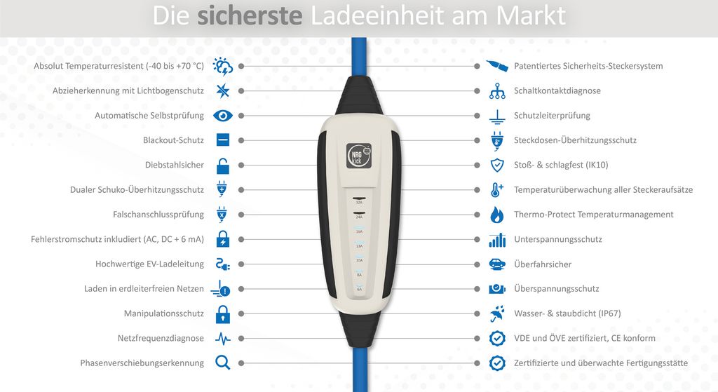 32A - Wallbox mobile avec une puissance de charge de Câbles de charge pour voitures électriques NRGkick 32A 5m Set Optimal, adaptateur et sac inclus Prix à partir de 990,00 € (04.11.2025). Acheter maintenant Kit pour les déplacements · Avec câble de 5 m · Différents embouts de prises · Sac de transport pratique Tout savoir sur l'installation d'une borne de recharge pour voitures... Borne Recharge Mobile Nrgkick 32a Prise Schuko Incluse Borne Recharge Mobile - Pour Voitures Électriques, Avec Adaptateurs Et Sac NRGkick 32A 10m Recharge Sécurité Détection Température Des produits de qualité supérieure