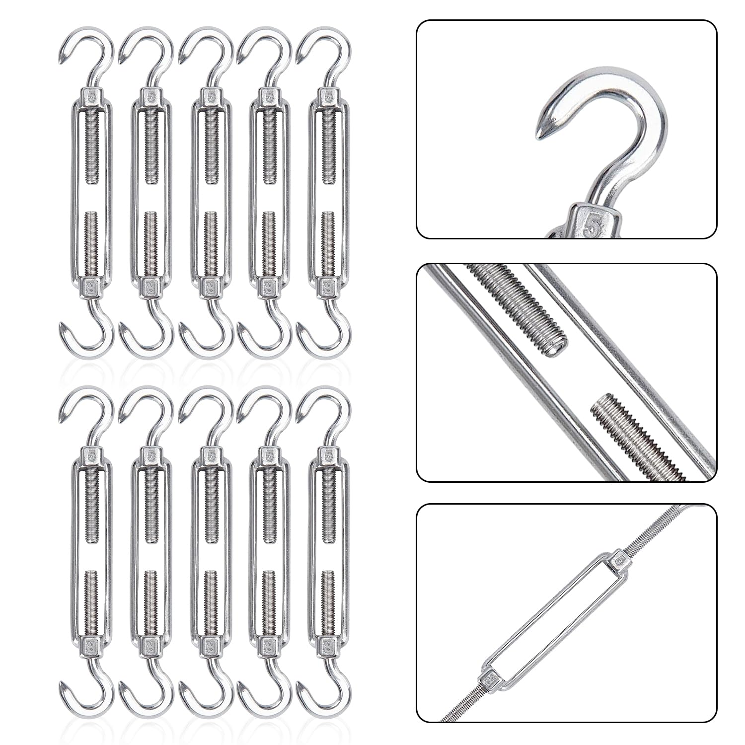 Cela permet de régler facilement la tension et la longueur du câble. Lot de 10 Tendeur Cable Inox Kit M5 avec Serre Cable Inox et Cosses, Tendeurs de Câbles Métalliques Réglable, Tension du Tendeur en Acier Inoxydable, Kit Fixation Voile D'ombrage pour Corde, Linge Tendeur fil a linge exterieur utilise un double mécanisme de verrouillage antidérapant via une structure filetée de précision et des pinces robustes, garantissant l'absence de jeu ou de risque de glissement accidentel sous des charges dynamiques. Installation rapide : Le serre cable acier peut être rapidement serré ou desserré, ce qui permet d'économiser du temps et des efforts lors de l'installation et du retrait. Il offre des solutions de tension et d'ancrage stables et fiables pour les installations extérieures et la décoration intérieure. La conception des accessoires du câble métallique, qui améliore la friction, empêche efficacement le glissement du câble, améliorant ainsi la fiabilité de la fixation. Spécifications : Nom : Tendeur tige filetée Type : M5 Couleur : Argent Matériau : Acier inoxydable 304 Contenu du paquet : 2x Tendeur de fil à tendeur 4x Colliers de serrage en U 4x Manchons de câble TooTaci Corde en Acier Inoxydable à Suspendre Kit, 30M Cable Filin L'ouverture en forme de C permet un démontage rapide, tandis que la structure fermée en forme de O assure un verrouillage sûr à long terme. Il convient à une utilisation fréquente et à long terme sans compromettre les performances. Cela garantit une fiabilité à long terme sans rouille ni rupture dans des environnements difficiles tels que l'humidité ou le brouillard salin. MATÉRIAU DURABLE - Le tendeur de câble en acier inoxydable 304 offre une excellente résistance à la corrosion et à l'eau, idéal pour une utilisation en extérieur à long terme. Sa conception robuste garantit une durabilité dans divers environnements Serre Cable Inox Kit Serre-câbles Inox Kit Tendeur Câble Inox M5 - Serre-Câbles Acier 304 - 6 Pièces Pour Cordes, Câbles, Éclairage Tendeur Voile Ombrage Tendeur Réglable Voile Ombrage Construction en acier inoxydable 304 : Le tendeur fil a linge est fabriqué en acier inoxydable 304, offrant une résistance à la corrosion et une prévention de la rouille exceptionnelles.