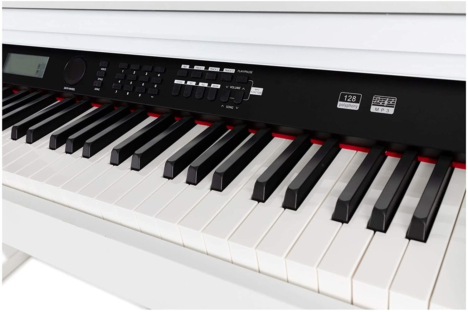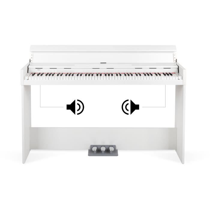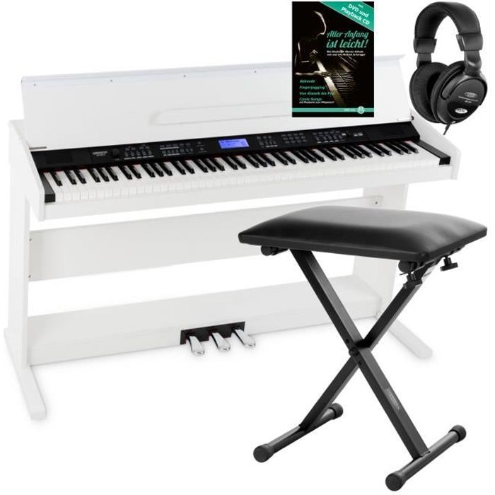 Banquette de piano de qualité supérieure. Grâce au manuel d'utilisation détaillé illustré, le piano électrique DP-2688A peut également être utilisé par les novices., 20 minutes. En mode chanson, vous pouvez choisir parmi une grande variété de chansons pour améliorer ses compétences musicales. Fonction d'enregistrement et de lecture. Piano Meuble Blanc Piano Numérique FunKey DP-1088 - 88 Touches Sensibles, 20 Sons, 3 Pédales, Blanc Mat Piano 88 Touches Pour jouer dans un grand public, la sortie casque jack 6,3 mm permet de connecter le piano à des systèmes stéréo ou PA. La portée de l'enregistrement comprend 180 cycles généreux. FunKey DP-2688A BM Set de Piano Numérique Marron Mat Casque stéréo dynamique Le casque inclus dans le kit offre un son riche et équilibré avec des basses riches et des aigus clairs. 88 touches marteaux avec dynamique de frappe , 360 sons. Avec ses 88 touches au look piano, ses 360 sons, son automatisme avec 160 rythmes d'accompagnement, 80 chansons de démonstration, sa fonction d'apprentissage, son lecteur MP3 intégré et ses haut-parleurs stéréo puissants, il établit de nouveaux standards dans sa catégorie de prix et ravira les musiciens de jeunes à âgés. La sortie casque à l'arrière offre la possibilité de s'entraîner en silence. Les jeux ennuyeux de l'échelle sonore appartiennent au passé et, en particulier chez les enfants, les ressentiront rapidement des sentiments de réussite. Fonction Split et Dual Le FunKey DP-2688A : la star élégante des pianos d'entrée de gamme. Clavier puissant avec clavier à marteaux! Le DP-2688A a été conçu pour les débutants désirant les fonctions d’un clavier moderne, mais préférant la sensibilité de jeu d’un acoustique Ce banc de piano offre en plus de son aspect élégant en blanc mat des caractéristiques telles que des pieds stables en caoutchouc antidérapant, un mécanisme de broche précis et facile à manier pour le réglage de la hauteur et une assise durable et confortable avec housse en cordon blanc. FunKey DP-2688A 88 Touches Classic Cantabile DP-50 WM E-Piano Blanc Mat Set Pianos Numériques Grand écran et utilisation intuitive Grâce à son écran rétro-éclairé bleu à contraste élevé et à sa disposition claire des touches, il offre un confort d'utilisation absolu dans un grand nombre de fonctions. Protection de clavier pratique. Seul un tournevis cruciforme est nécessaire. Mode apprentissage et chansons de démonstration. Instruments pour enfants, étudiants de musique et débutants ambitieux avec de nombreuses fonctions. Haut-parleurs stéréo puissants et sortie ligne Les haut-parleurs stéréo de 15 W intégrés sur la partie inférieure assurent un son puissant. L'accompagnement automatique intégré est particulièrement conçu pour les débutants qui souhaitent se laisser accompagner par 160 styles de rock à Bossa Nova en passant par le genre de battement comme par une bande. Haut-parleurs stéréo intégrés de 2x 30 Watt, dimensions(BxHxT): 136 x 86 x 50 cm, poids: 52 kg, couleur: blanc mat Le DP-2688A a été spécialement conçu pour les débutants qui recherchent les fonctionnalités d'un clavier moderne mais qui souhaitent avoir l'aspect d'un piano électrique adulte. FunKey DP-2688A WM Piano numérique Blanc mat Clavier puissant avec piano en marteau. Les notes à jouer sont affichées directement sur l'écran. Jouer au clavier n'a jamais été plus amusant.