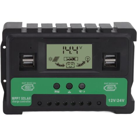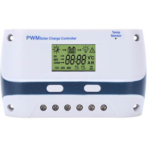 Victron Energy - Régulateur solaire PWM 20A LCD&USB - 12/24V Veuillez vous assurer que la batterie a une tension suffisante lors de la première installation afin que le contrôleur puisse identifier correctement le type de batterie., 2., Installez le contrôleur aussi près que possible de la batterie pour éviter les chutes de tension causées par de longs fils, affectant le jugement normal de la tension., 3., Ce contrôleur convient uniquement à diverses batteries (y compris ouvertes, scellées, gel, etc., )., 4., Ce contrôleur ne peut utiliser que des panneaux photovoltaïques comme Régulateur Batterie écran LCD USB FTVOGUE Contrôleur De Charge Solaire, Régulateur Photovoltaïque PWM Contrôleur Intelligent Pour Camping Car Spécification : Type d'élément : Contrôleur de charge solaire Tension du système : 12 V/24 V auto-adaptatif Tension PV maximale : jusqu'à 23 V dans une batterie 12 V, jusqu'à 46 V dans une batterie 24 V Sortie USB : 2 x sorties USB, 5 V/2,5 A (maximum) Courant de veille : Le paramètre suivant correspond uniquement au système 12 V, si vous utilisez du 24 V. [Conception économe en énergie] Avec une consommation d'énergie en veille ultra faible et une gestion intelligente de l'énergie, ce régulateur solaire optimise l'utilisation de la batterie, prolongeant la durée de fonctionnement de l'appareil tout en améliorant l'efficacité et la durabilité globales du système. [Double tension 12 V 24 V] Conçu pour la polyvalence, ce contrôleur de charge de panneau solaire détecte et s'adapte automatiquement aux systèmes 12 V et 24 V, ce qui le rend adapté à diverses configurations solaires, des petites cabines aux camping-cars et applications marines. Description Régulateur solaire 60A PWM 12v / 24v. cette Le régulateur solaire PWM a une identification automatique du niveau de tension du système TMISHION Chargeur de batterie solaire PWM Contrôleur PWM du contrôleur Utilisez les boutons haut et bas pour ajuster les valeurs des paramètres comme vous le souhaitez. [Écran LCD multifonctionnel] Surveillez les performances de votre système avec l'écran LCD clair affichant les données en temps réel, y compris les courants de charge et de décharge, la température de production d'énergie accumulée et plus . 191,00 g / 6,74 oz Liste des paquets : 1 x contrôleur Comment utiliser : 1., Appuyez brièvement sur le premier bouton de menu pour parcourir les différents écrans et paramètres., 2., Appuyez longuement sur le premier bouton de menu pendant 3 secondes lorsque vous voyez l'écran de menu que vous souhaitez définir, entrez en mode de réglage manuel où les chiffres clignoteront.