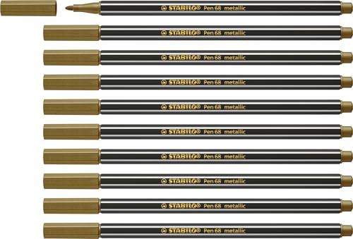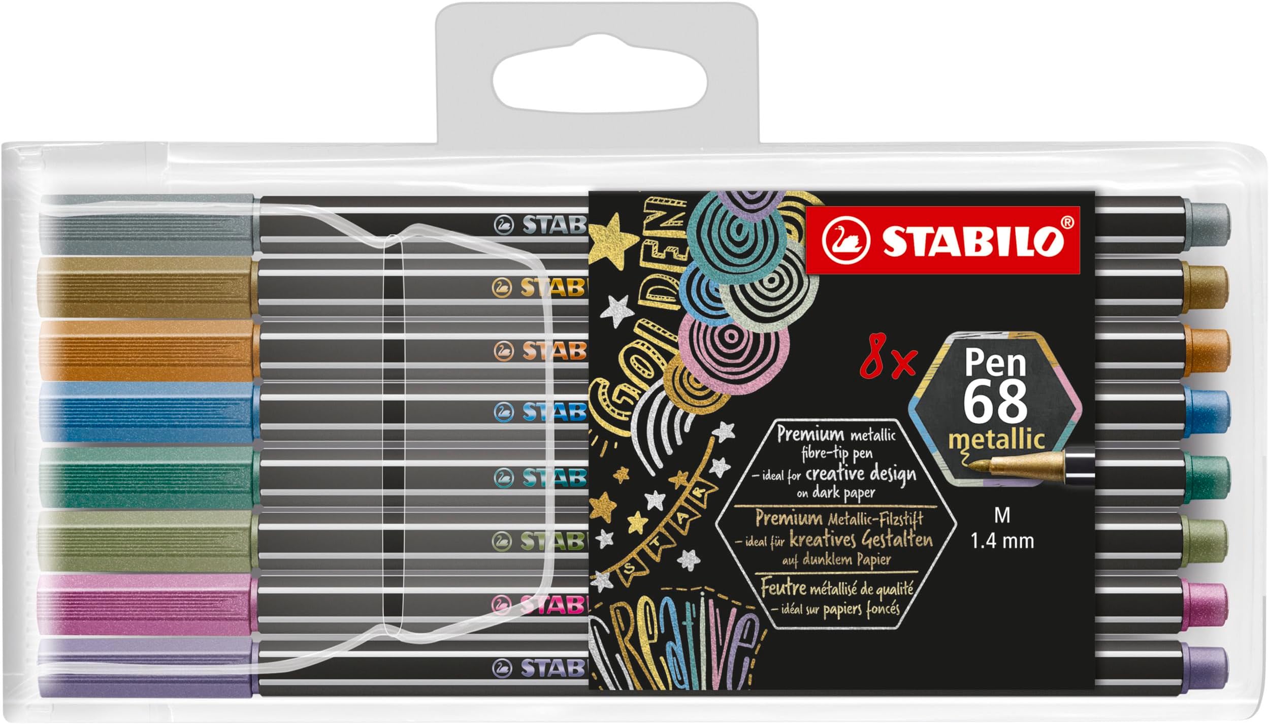 FEUTRE ECORESPONSABLE : le feutre de coloriage STABILO Pen 68 metallic est certifié ISCC Plus. Elle permet de réaliser des effets métallisés lumineux résistants à la lumière, tout particulièrement sur les papiers foncés, mais également sur le carton, le métal et d'autres surfaces lisses. FEUTRE METALLISE DE QUALITE : STABILO Pen 68 metallic est un feutre de coloriage à encre métalissées doté d'une pointe moyenne ogive ( tracé 1,4 mm) fabriqué en Allemagne. COULEURS METALLISEES LUMINEUSES : le feute de coloriage Pen 68 metallic offre des couleurs d'une grande luminosité même sur supports noirs ou foncés. Elle protège également vos feutres lorsque vous les transportez. Feutre Dore Et Argente Feutres Métalliques Créatifs STABILO Pen 68 Les couleurs ne s'effacent pas après un court instant de séchage. Avec une largeur de tracé de 1,4 mm, STABILO Pen 68 metallic est idéal pour la décoration, le dessin et le lettering. Encre à base d'eau riche en pigments, disponible en 8 coloris scintillants métallisés : or, argent, cuivre, violet métallisé, bleu métallisé, vert métallisé... Feutre Créatif Multi-surfaces STABILO Pen 68 Feutres De Dessin Métallisés X8 Et Pochette Feutre Dessin Métallisé Son encre à base d'eau est disponible en 8 coloris métalliques et scintillants : or, argent, cuivre, violet métallisé, bleu métallisé, vert métallisé, vert clair métallisé et rose métallisé. Sa pointe moyenne ogive permet un tracé de 1, 4 mm d'épaisseur. Stabilo Boîte Métal 8 Feutres Métallisés Pen 68 Pointe Moyenne Metallic X 10 à retrouver en drive ou livraison au meilleur prix dans le rayon Dessin et Peinture La boîte métal est le format idéal à offrir ou s'offrir qui permet de bien ranger ses feutres et de visualiser en un clin d'œil toutes les couleurs. FEUTRE CREATIF MULTI-SURFACES : le feutre pen 68 metallic peut s'utiliser sur les surfaces lisses telles que le métal, la feuille d'aluminium ou le papier. Il rend vos créations uniques, brillantes et festives : cartes, menus, lettering, journal personnel., ., ., Son encre à base d'eau riche en pigments et à l'excellent pouvoir couvrant sèche rapidement. Stockage horizontal pour une durée de vie optimale