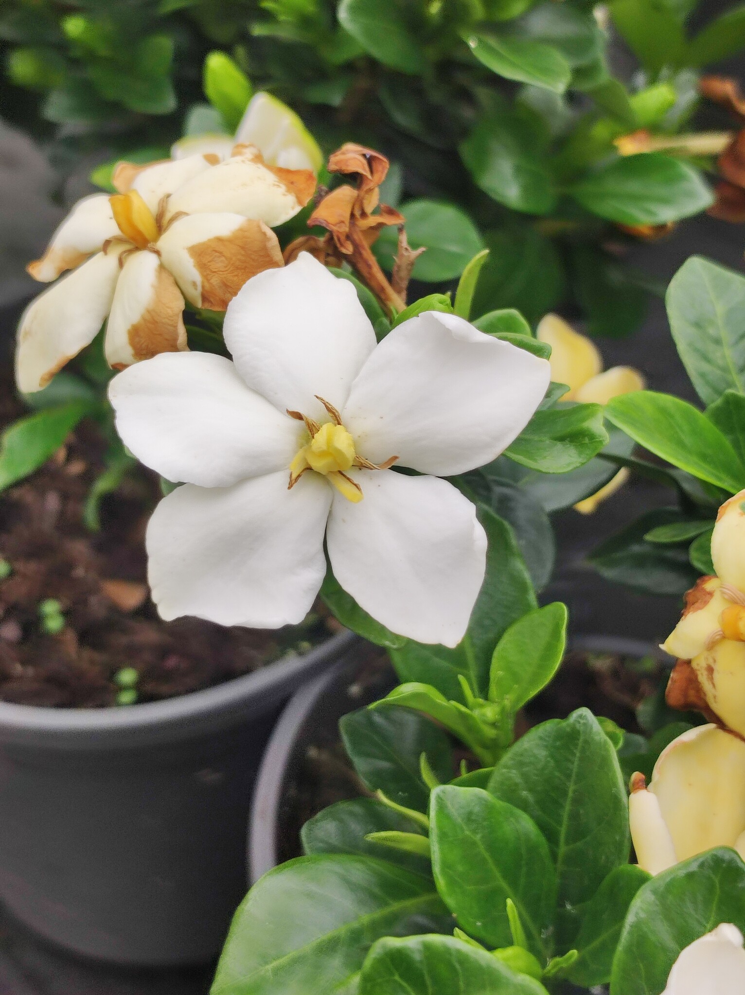 Le Gardenia jasminoides 'Kleim's Hardy' possède un beau feuillage vernissé et persistant. Son excellente croissance, sa bonne ramification, sa facilité de culture et sa relative résistance au gel, permettent de l'utiliser comme un gardénia de jardin ou une plante de terrasse et patio Le spectacle se renouvelle tout au long de l’été avec une belle remontée à fleurs, lorsque la plante est bien installée. Plante Terrasse Résistante Gel GARDENIA Jasminoïdes 'Kleim's Hardy' - Pépinières Ripoche - Nantes Gardénia Jasminoides Kleim's Hardy Pot 3-4 Litres Conteneur de 3 à 4 litres. Les plantes sont des êtres vivants, elles évoluent avec le temps. Vous pouvez et vous constaterez des évolutions dans le temps. En fleurs de mai à septembre, le Gardenia ‘Kleim’s Hardy’ produit de grosses fleurs étoilées, de 5cm de diamètre, blanches au parfum envoutant. Plantez-le dans un massif mi-ombragé, ou en pot dans un sol frais, riche en humus et léger Gardénia (Gardenia jasminoides) : entretien, arrosage, rempotage La première floraison a lieu entre la fin du printemps et le début de l'été. Son excellente croissance, sa bonne ramification, sa facilité de culture et sa relative résistance au gel, permettent de l'utiliser comme un gardénia de jardin ou une plante de terrasse et patio. Le Gardenia jasminoides 'Kleim's Hardy' est un arbuste de petite dimension (1m x 1m) produisant d'élégantes fleurs crème aux pétales cireux et épais, remarquablement parfumées.
