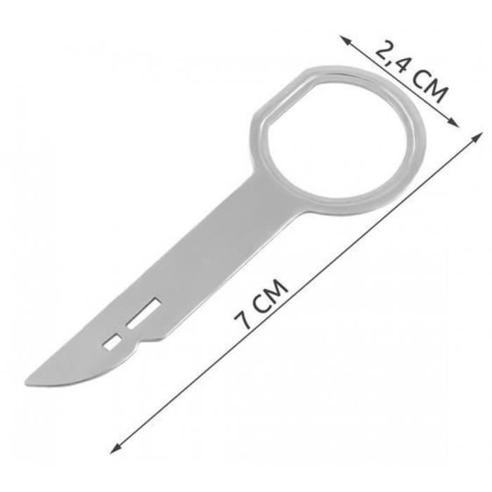 Kit d'extraction d'autoradio complet : comprend tous les outils nécessaires pour un démontage sûr et efficace de l'autoradio, y compris les clés de démontage, les étriers de déverrouillage et les outils de démontage de l'autoradio. Idéal pour les professionnels et les bricoleurs Il suffit d'insérer l'outil clé dans les ouvertures latérales droite et gauche et de retirer la radio de déverrouillage. Clé Démontage Radio Voiture Kit De Verrouillage/déverrouillage De Porte électrique De Voiture 12V 4 Clés Universelles Radio Acier Inox Informations sur le produit : Matériau : acier inoxydable. Facile à utiliser : insérez d'abord les clés dans les fentes avec le bord droit de la radio jusqu'à ce qu'elle s'enclenche, puis répétez cela pour les autres fentes, tirez la radio vers l'extérieur avec l'anneau d'outil, une fois la radio retirée, desserrez les clés en appuyant sur les languettes à ressort des deux côtés de la radio et retirez-la. 【Ensemble de 4 outils】Ce kit contient 4 outils de déverrouillage d'autoradio pour vous offrir un maximum de flexibilité et de polyvalence. Paquet] : 4 Pièces clef extraction autoradio, argent, taille : 7 x 2,5 cm.[Haute Qualité] : Autoradio adaptateur demontage outils est fabriqué en acier inoxydable de haute qualité avec une surface lisse, qui est durable et fiable. Cela vous permet d'utiliser l'outil en toute confiance, car il vous fournit des performances fiables et à long terme.[Humanised Design] : Chaque... TOOAD 4 outils de démontage de panneaux de porte pour tableau de bord, radio, audio, etc Service : Si vous avez des questions sur nos produits, veuillez nous contacter par e-mail et nous vous répondrons à l'intérieur. Grande compatibilité : ces outils sont compatibles avec une variété de marques de voitures. Ce kit comprend : 4 outils de démontage d'autoradio., Caractéristiques : 1., Fabriqué en acier inoxydable, robuste et durable., 2., Ces outils sont extrêmement polyvalents et compatibles avec une large gamme., 3., Le retrait des autoradios peut parfois être une tâche fastidieuse où il y a un risque de dommages et de blessures.