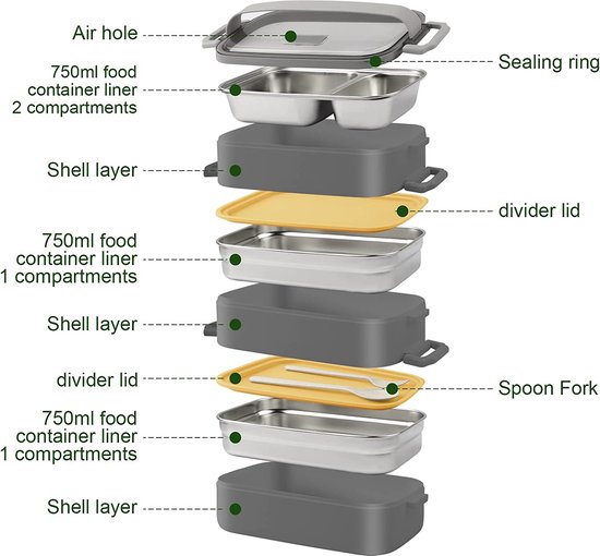 Caractéristiques: Couvercle fonctionnel 1., 2 en 1 : la boîte à bento en acier inoxydable est dotée d'un compartiment à ustensiles intégré et comprend des baguettes et une cuillère. Offrez-vous une expérience culinaire moderne avec cette boîte bento en acier inoxydable. Parfaite pour les repas équilibrés et faits maison, elle vous permet de transporter vos plats favoris tout en préservant leur fraîcheur Le couvercle peut accueillir votre téléphone et se transforme instantanément en support pour vous permettre de manger et de regarder des émissions simultanément., 2., Chauffable à l'eau : le récipient intérieur de cette boîte à lunch est amovible et peut être rempli d'eau chaude pour réchauffer les repas ou éviter qu'ils ne refroidissent, ce qui le rend pratique., 3., Scellé et étanche : Grâce à ses quatre loquets et à son joint d'étanchéité en silicone, le récipient intérieur reste frais et étanche au quotidien. Couvercle Fonctionnel 2 En 1 : la boîte à bento en acier inoxydable est dotée d'un compartiment à ustensiles intégré et comprend des baguettes et une cuillère. Nous fournirons un service après-vente jusqu'à ce que vous soyez satisfait. Boîte Bento Acier Inoxydable Boîte à Lunch En Acier Inoxydable Boite à Bento Scellée Pour Bento Avec Baguettes Et Cuillère D'une capacité de 1000 ml et doté de compartiments aux trois quarts, il permet de conserver séparément le riz, les fruits et les plats principaux., 4., Chauffable : la boîte à bento en acier inoxydable peut être chauffée au micro-ondes à des températures comprises entre -20 °C et 120 °C. Chauffable : la boîte à bento en acier inoxydable peut être chauffée au micro-ondes à des températures comprises entre -20 °C et 120 °C. Le récipient intérieur est en acier inoxydable SUS304 et est doté d'une valve respirante pour équilibrer la pression d'air interne et externe, facilitant ainsi l'ouverture. Caractéristiques: Matériau : acier inoxydable, pp Capacité : 1000 ml Dimensions : 22 cm de long x 14 cm de large x 7 cm de haut/8,7 x 5,5 x 2,8 Liste des paquets : 1 x boîte à bento en acier inoxydable Remarques : 1., En raison des différences entre les écrans, la couleur réelle de l'article peut être légèrement différente de celle de la photo. Boîte à Lunch, 4 Compartiments en Acier Inoxydable 304 Bento Box Nous garantissons qu'elle est identique à celle présentée sur les photos., 2., Veuillez prévoir une légère différence de dimension de 1 à 2 cm en raison de différentes mesures manuelles. Boîte à déjeuner pour enfant avec compartiments en acier inoxydable...