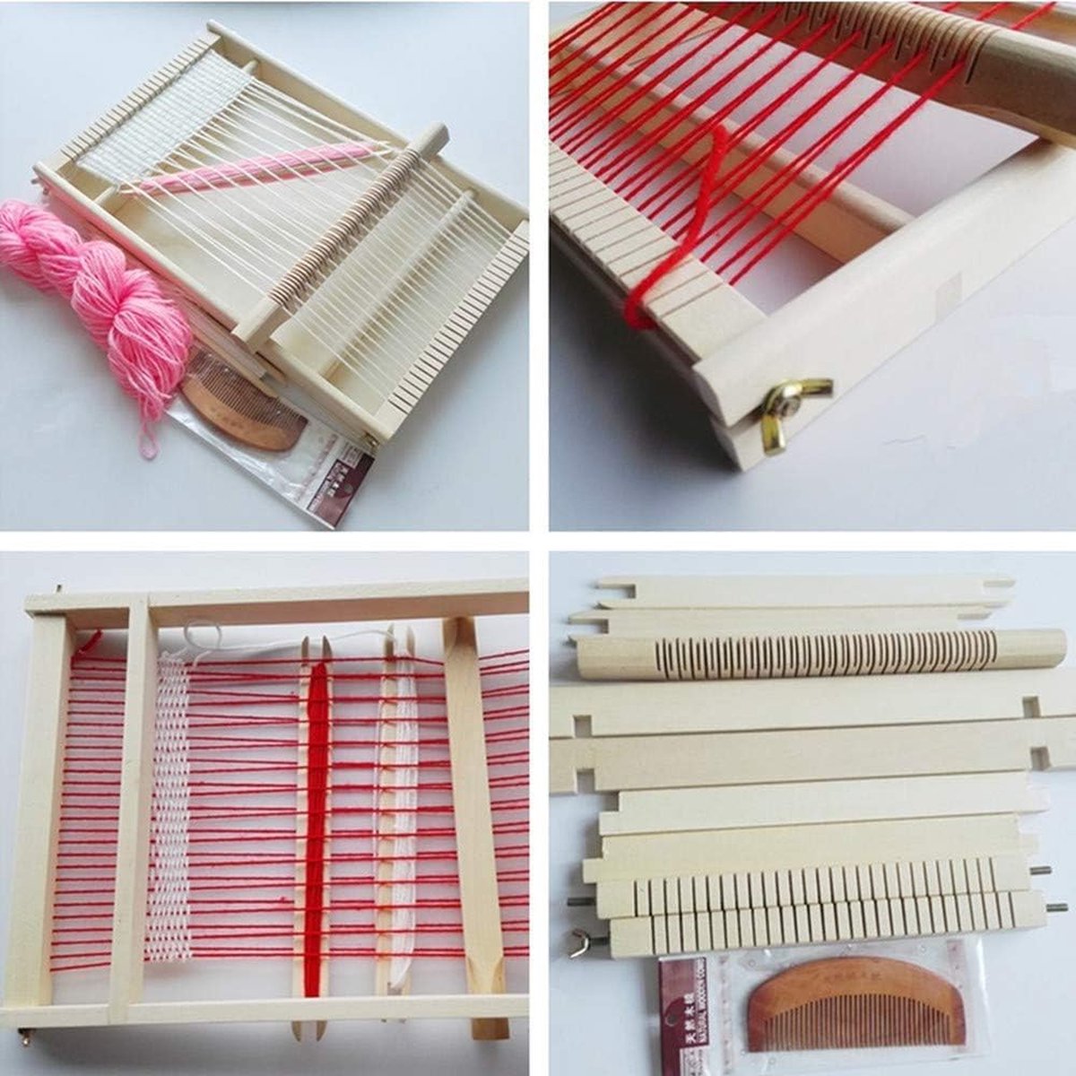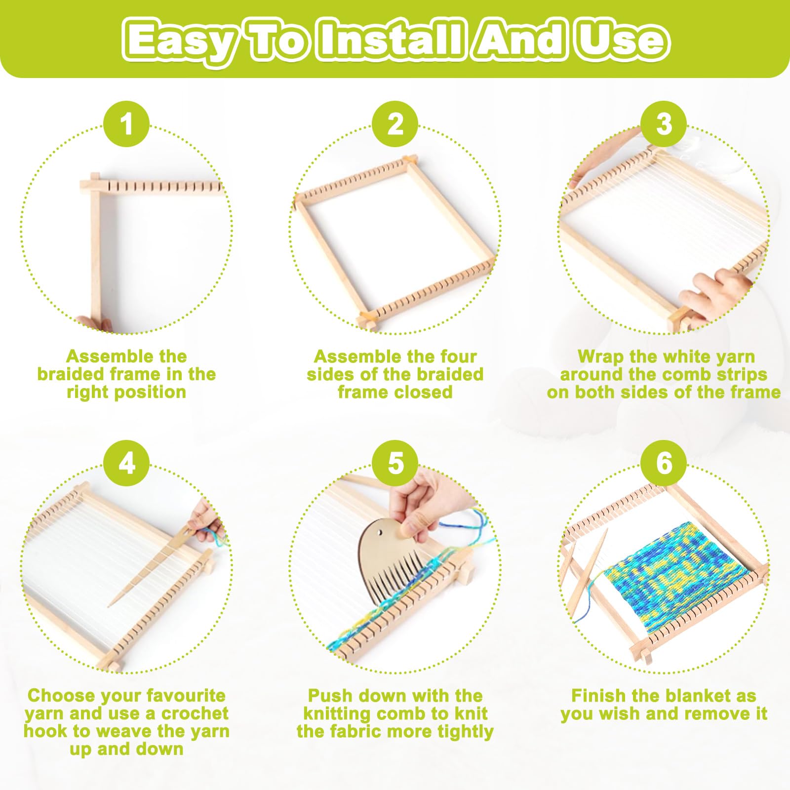 La taille assemblée est de 24 x 28 cm., Étapes d'assemblage : 1., Placer les quatre blocs rectangulaires en bois sur le cadre et les fixer dans les fentes correspondantes., 2., S'assurer que le fil de broderie blanc n'est ni trop lâche ni trop serré dans le cadre en bois., 3., Enrouler la laine autour du cadre de tissage., 4., Fixer le fil double face en forme de S sur le cadre en bois., 5., Retirer le peigne, ajuster les fils de chaîne et pousser vers le haut pour fixer fermement le tissu. Le kit de démarrage de tricot pour enfants et adultes se compose de 1 cadre à tisser en bois naturel de 40 x 29 cm, 1 boîte cadeau, 1 métier à tisser, 1 peigne, 1 câble en nylon, 1 bobine de fil Caractéristiques: Matière: Cadre en hêtre + Laine Couleur du produit: Couleur bois naturel (cadre), Fil multicolore Dimensions du métier assemblé: 24 x 28 cm Dimensions du peigne: 7 cm Dimensions des aiguilles: 20 cm & 11 cm Contenu du colis: 1 x Métier à tisser 1 x Peigne à tisser 2 x Aiguilles à tisser (tailles différentes) 2 x Bobines de fil de chaîne blanc 4 x Bobines de laine (Jaune, Blanc, Rose mélangé, Vert mélangé) 【Développer la Patience et la Créativité】: Notre métier à tisser est parfait pour les activités parent-enfant et les ateliers artisanaux. Il offre une expérience amusante et éducative pour les débutants qui aiment tisser. 【Cadeau Créatif pour Toute Occasion】: Ce kit de tissage débutant est l'outil parfait pour créer des articles artisanaux tels que des tentures murales, des écharpes et des dessous de verre. La surface lisse sans échardes le rend facile à utiliser, ce qui en fait le choix idéal pour les travaux manuels ! METIER A TISSER - Nature et Découvertes Notre laine offre une douceur et un confort exceptionnels, avec une stabilité qui résiste à la déformation et maintient une apparence fraîche. Il est facile à assembler et à utiliser - le montage ne prend que quelques minutes. 【Laine Douce】: Notre grand métier à tisser est livré avec 4 bobines de laine (3 colorées + 1 blanche). Pourquoi ne pas vous lancer dans l'art du tissage et créer des pièces uniques ? Avec ce coffret complet, initiez-vous facilement au tissage et libérez votre créativité Tissage Laine Colorée Xinxinphi Métier Tisser Enfant Avec Laine Colorée Et Navette Métier à Tisser Bois Enfant Il aide à stimuler efficacement la créativité, les compétences pratiques et la dextérité, tout en cultivant la patience et l'imagination.