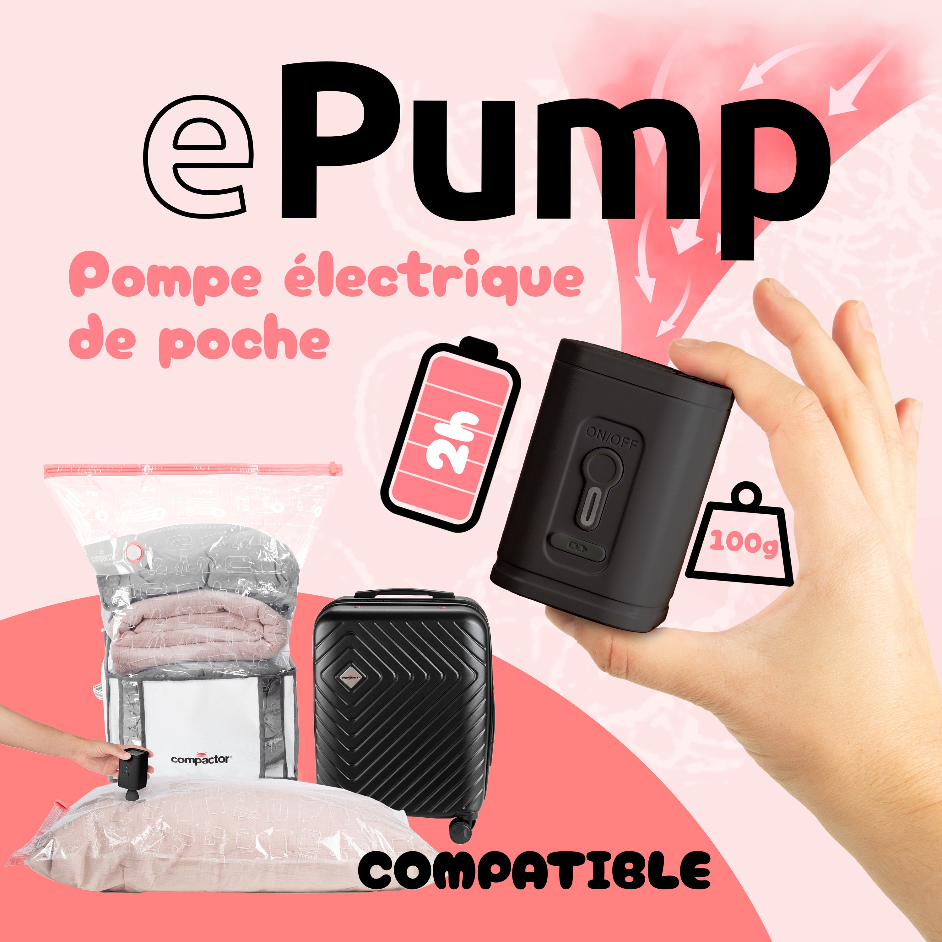 Sa puissance d’aspiration de 30W permet de faire le vide en quelques secondes, que ce soit pour vos placards, vos valises ou votre dressing. Pompe électrique 30W rechargeable USB. Compacte, légère et puissante. Idéale pour compresser tous sacs sous vide Compactor. Vitesse, autonomie, confort Son design compact (8 x 5,8 x H. Compatible avec l’ensemble des sacs et housses sous vide de la marque Compactor, elle est livrée avec 4 embouts pour s’adapter à tous les formats. 100 % compatible : fonctionne avec tous les sacs sous vide Compactor, dressing et valises inclus Sac Sous Vide Compactor - Pompe électrique Portable Sans Fil Pour Sacs De Rangement Pompe A Vide Sac Sous Vide 7,6 cm) et sa finition noire élégante lui confèrent une allure sobre et pratique. Pensée pour un rangement sans effort, à la maison comme en déplacement, cette pompe électrique sans fil devient vite indispensable pour garder vos affaires bien organisées et gagner de la place facilement. Design compact et léger, idéal pour voyager Ultra légère, elle se glisse facilement dans un tiroir ou un sac de voyage. Compacteur Inviolable À Plaque De Poussée Manuelle Avec Profondeur De Compactage Cette pompe est réversible : elle aspire, mais peut aussi souffler de l’air – un vrai plus pour certaines housses ou pour gonfler de petits objets. Compatible avec tous les sacs sous vide Compactor.Sa puissance d’aspiration exceptionnelle compresse vos sacs sous vide rapidement. Son format léger et compact, associé à une finition noire, en fait l’accessoire idéal pour vos voyages. Grâce à sa recharge USB, vous bénéficiez d’une autonomie prolongée, batterie au lithium polymère, sans piles ni câbles