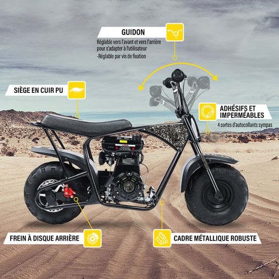 Gepard - Un compagnon idéal sur les pistes de motocross. Le design de course du mini crossbike Gepard est disponible en quatre couleurs de vernis qui attirent tous les regards. Grâce au moteur à deux temps agile de 49 cm³ monocylindre et au carburateur sport de 15 mm, la moto pour enfant High End Cross accélère en un tour de main jusqu'à 35 km/h. De plus, la fourche Upside Down à l'avant et l'amortisseur réglable sur l'essieu arrière créent une suspension souple après les sauts et les drops. Il y a ainsi une corde à tirer sur la moto pour enfant, qui est fixée au bras. Pour des performances optimales dans le trial, la moto pour enfant Gepard dispose d'une combinaison sophistiquée de composants individuels. Ainsi, le mini vélo... Moto thermiques, mini motos thermiques et moto-cross De plus, les freins à disque perforés à l'avant et à l'arrière assurent un contrôle précis et un retard extrême., Moteur : 2 temps 49 cm3., Freins : Freins à disque perforés à l'avant et à l'arrière. - Cadre renforcé – Gel parfaites freins à disque – 10 pneus Le filtre à air sport et l'échappement sport assurent une vitesse maximale en continu. Grande taille Pour des performances optimales dans le trial, la moto pour enfant Gepard dispose d'une combinaison sophistiquée de composants individuels. Quad Enfant Actionbikes Motors Mini Moto Cross Enfants Gepard 49 CC - Filtre à Air - Échappement Sport - Pneus à Air - Pocket Bike - Moto - Motocross - Dirt Bike - Enduro - Dirtbike (Bleu Quad Enfant Essence Les quads de poche et le crossbike 2 temps à moteur de réglage haut de gamme de 49 cm3 pourraient offrir une durabilité plus longue et des performances élevées avec un filtre à air sport et un démarreur de câble en aluminium En outre, les casques de motocross pour enfants et les vêtements de protection sont absolument obligatoires. En tant que poids léger de 24 kg, la mini moto cross de Miweba est facile à manier même pour les jeunes jeunes enfants jusqu'à 65 kg. Mini moto cross « Gepard ». Vous voulez acheter un vélo de cross pour enfant qui se distingue par ses performances et ses caractéristiques particulières ? Alors la moto pour enfant Gepard avec réservoir de 2 l et équipement de tuning est exactement ce qu'il vous faut pour conquérir de nouveaux horizons du motocross pour enfant. Miweba - Mini vélo de cross pour enfant « Gepard » - En aluminium Pull Start – abreiß laisse de sécurité – Fourche Upside Down