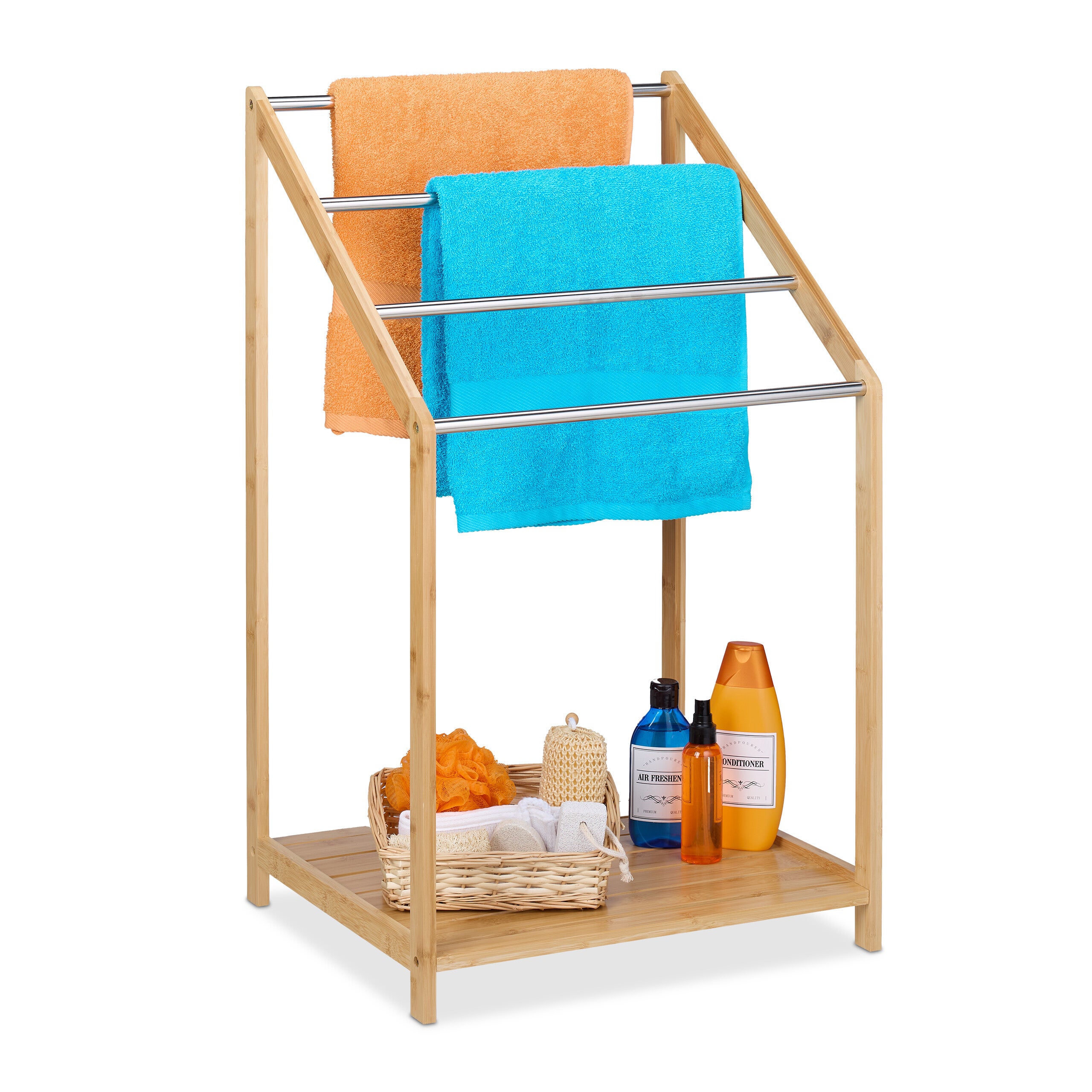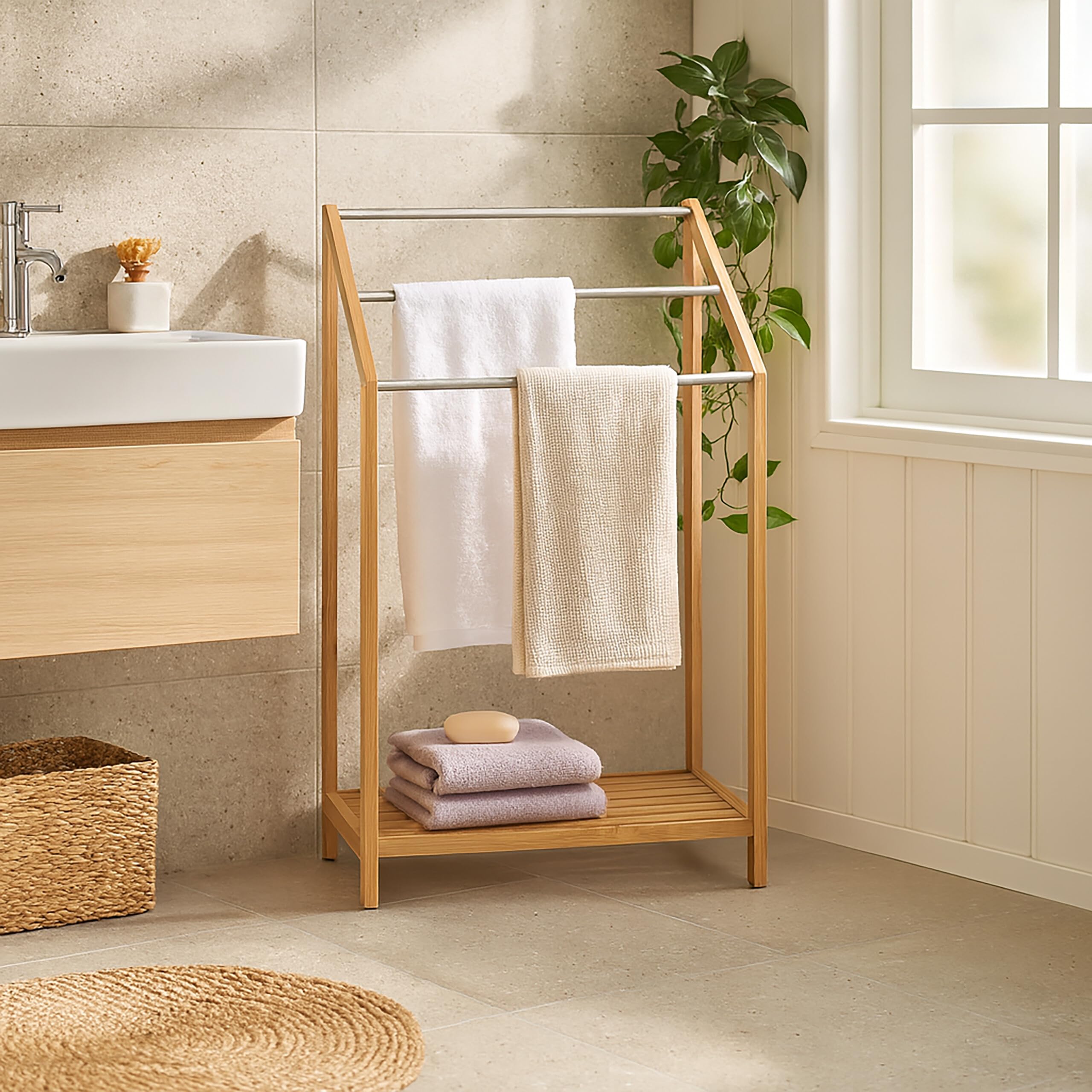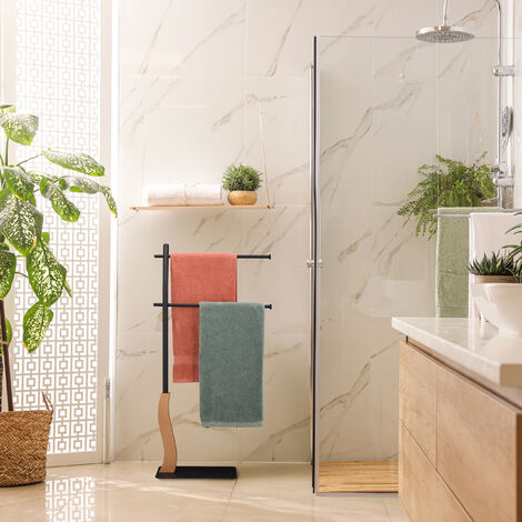 Largeur de la barre utile : environ 26 cm environ Grâce à la plaque de base lourde et aux tampons de sol antidérapants, un support stable du porte-serviettes est garanti. Avec 2 supports décalés pour un séchage rapide Résistant Dans différents pays, le bambou est même utilisé pour l'échafaudage. Porte-serviettes debout Avec le porte-serviettes de douche debout, vous pouvez sécher vos serviettes de bain et vos serviettes de bain sans prendre de place. Détails : dimensions du support HLP : env. Hauteur de la barre : environ 80 et 72,5 cm Chic : porte-serviettes en acier et bambou - Avec 2 barres bien espacées pour un séchage optimal Plaque de base (l x P) : environ environ 30 x 20 cm Moderne : sèche-serviettes au design moderne et géométrique - Patins protecteurs Serviette Bambou Support Serviette Salle De Bain Relaxdays Nature Porte, Support Serviettes De Bain, 4 Barres, Bambou Rangement, 87 X 60,5 X 37,5 Cm, Noir, Métal Porte- Serviette Salle De Bain Support Libre Debout Relaxdays Porte-Serviettes en Babou, 4 Barres, 1 étagère, HxLxP Contenu de l'emballage 1 porte-serviettes de bain en pièces détachées avec instructions (français non garanti) et matériel de montage. Alors ce porte-serviettes élégant et moderne est fait pour vous ! La combinaison de matériaux apportera une touche d’originalité à la pièce. Les barres en décalé offrent une circulation de l’air optimale, permettant ainsi de sécher rapidement vos textiles. Fini les serviettes mouillées et désordonnées Esthétique La teinte naturelle des meubles en bambou s'adapte à tous les intérieurs. Combinaison d'acier noir et bambou Entretien facile Essuyés régulièrement avec un chiffon humide, les produits en bambou restent comme neufs pendant longtemps. Relaxdays Porte-serviettes avec surface de rangement, montage mural, 3 Porte-serviettes avec détails en bambou Absorbe l'humidité Le bambou peut être placé sans problème dans la salle de bain ou la cuisine. Dimensions (H x l x P) : environ 81 x 39,5 x 20 cm Base lourde et patins antidérapants pour une bonne stabilité Le support de salle de bain dispose de 2 barres et peut être placé librement dans la pièce sans avoir à percer les trous.