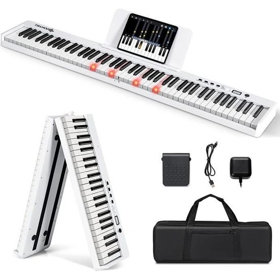 Description : Le piano numérique a une source audio DREAM française et des haut-parleurs stéréo doubles pour 380 sons, 128 rythmes, et 88 démos. Le piano numérique à 88 touches combine une excellente portabilité et une conception peu encombrante sera un choix parfait pour les débutants et les joueurs de tous niveaux Avec ses 88 touches de taille standard sensibles à la vélocité, le clavier portable convient à la fois aux débutants et aux musiciens professionnels. La fonction de partage permet à 2 joueurs de jouer simultanément, ce qui le rend parfait pour les cours de musique ou les jeux à deux. Le câble USB, l'adaptateur et la pédale sont également inclus. Clavier Débutant Portable COSTWAY Avec Pupitre & Pédale Piano Numérique 88 Touches De plus, il prend en charge de multiples connexions avec une prise d'alimentation DC, une prise casque, une prise d'entrée/sortie audio, une prise de pédale de sustain et une prise de transfert USB, pour être connecté aux smartphones, tablettes et ordinateurs pour plus de musique. 【Connexion externe】Il y a différentes prises compatibles avec l'alimentation, les écouteurs, les pédales et autres appareils audio. Le pupitre amovible soutient parfaitement votre partition pour plus de commodité. 【Clavier de taille complète sensible à la vélocité】88 touches de taille complète vous permettent de ressentir comme si vous jouiez d'un piano traditionnel, tandis que les touches en grain de bois noir apportent une touche chaleureuse et naturelle. Clavier Electrique à 88 Touches 128 Rythmes 128 Notes Réglage Dynamique Interface MIDI/USB Fonction Bluetooth et Sac Plus important encore, le clavier sensible à la vélocité répond à votre dynamique de jeu. Marque. COSTWAY · Couleur. Blanc · Nombre de clés. 88 · Niveau de compétence. Débutant · Caractéristique spéciale. Fonction Bluetooth, Interface MIDI, Pédale de...