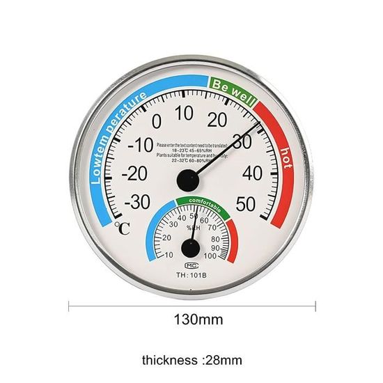 L'œillet de suspension est en laiton. BRESSER Capteur Thermo-hygrométrique sans Fil, Convient Aux Modèles De Bricolage - Découvrez notre offre Lot de 2 thermomètres hygromètres : 10 cm, analogiques, sans fil, montage mural, avec œillet de suspension, thermo-hygromètre po164 Thermomètre et hygromètre équipés d'un œillet de suspension, de sorte qu'il peut être facilement accroché aux murs, tables, réfrigérateurs, portes, incubateurs, serres, voitures, chambres de bébé, etc. Idéal pour accrocher dans votre salon ou entrepôt, pour une surveillance constante de l'environnement. Matériau : alliage d'aluminium, verre, plastique, laiton., Diamètre : 10 cm., Largeur : 2,5 cm. L'hygromètre et le thermomètre sont mis à jour toutes les 10 secondes pour vous informer des derniers changements de température et d'humidité. Le principe de fonctionnement mécanique assure des résultats de mesure stables à long terme et un thermomètre hygromètre analogique de précision est mis à jour toutes les 10 secondes pour vous informer des derniers changements de température et d'humidité de l'air. Trois couleurs différentes marquent la zone de confort pour un climat intérieur sain. Lot Thermometre Interieur TWQ-Lot De 2 Thermomètres Hygromètres : 10 Cm, Analogiques Hygromètre Intérieur Extérieur Plage de mesure de la température : -20-50 °C., Poids : 0,1 kg. Lot de 2 thermomètres pour réfrigérateur/congélateur avec zones de... Grand écran couleur - Thermomètre et hygromètre mural sans fil - Dispose d'aiguilles noires, d'un cadran blanc et d'une échelle claire pour faciliter la lecture. Pas besoin de piles : le thermomètre et l'hygromètre disposent d'un design sans batterie, à faible teneur en carbone et respectueux de l'environnement. Le principe d'action mécanique assure des résultats de mesure stables à long terme. Le thermomètre hygromètre de précision mesure avec précision la température de -20 à 50 °C et l'humidité de 0 à 100 % d'humidité relative, ce qui le rend idéal pour une utilisation en intérieur et en extérieur. Thermomètre extérieur robuste et durable, longue durée de vie Matériau de qualité supérieure : vous recevrez 2 thermomètres hygromètres de jardin, la base de la température et de l'humidité est en plastique, l'anneau extérieur et le cadran sont en alliage d'aluminium et le couvercle est en verre véritable massif. Thermomètre hygromètre analogique : comprenez rapidement les conditions environnementales actuelles Design sans piles, faible teneur en carbone et respectueux de l'environnement.