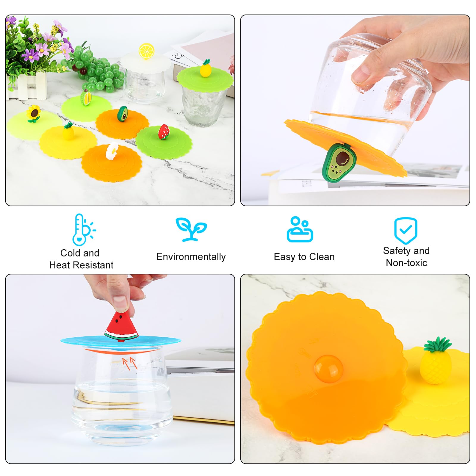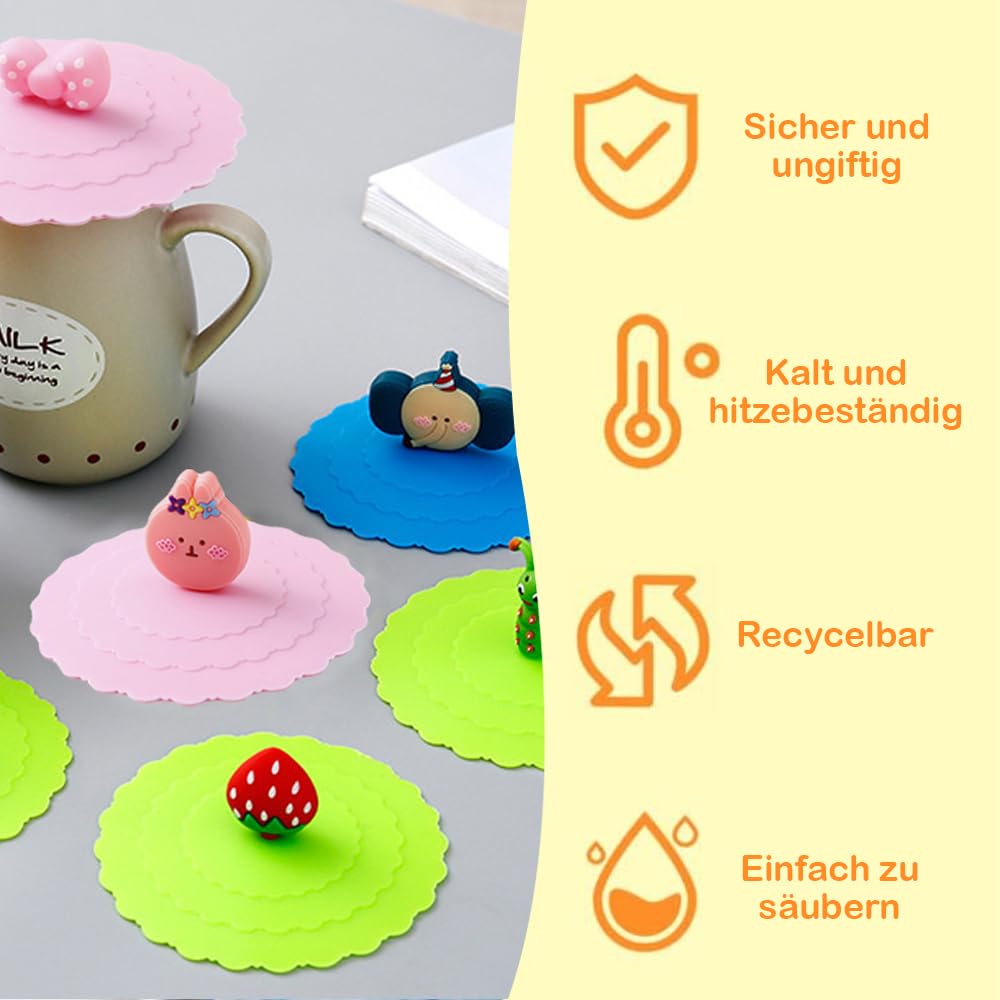 Couvercles en Siliconen Selbro® pour verres à boire - Lot de 8 Accessoire Cuisine Pratique Lot De 10 Couvercles En Verre En Silicone Pour Verre Anti-poussière, Couvercle En Verre Avec Poignée à Fruits, Couvercle En Verre Réutilisable Pour Verres à Boire, Couvercle En Silicone Couvercle En Silicone Pour Meuble À utiliser à l'extérieur pour garder les mouches, les guêpes et autres insectes nuisibles loin de votre boisson Lot de 10 couvercles en silicone pour verres à boissons. Les couvercles réutilisables en silicone anti-poussière de Cartoon sont doux et durables, agréables au toucher et peuvent être réutilisés Lot de 10 couvercles en silicone de 10 cm - Anti-poussière - Colorés - Pour gobelets à eau, verres à vin, tasses à café, à la maison et à l'extérieur Bonne étanchéité : appuyez légèrement sur le milieu, et le couvercle en silicone se ferme fermement sur tous les bords lisses tels que les tasses, les tasses et les verres, empêche la poussière, offre un joint hermétique et étanche, garde votre café ou thé chaud. ACTIVE DOOR & WINDOW Couvercles de pots en silicone de 100 mm, paquet... Facile à laver : les couvercles de gobelets réutilisables anti-poussière sont bien scellés et se pressent facilement sur le couvercle depuis le centre et soulèvent doucement les bords pour les enlever. Vous êtes libre de mélanger et de combiner ces poignées en forme de dessin animé avec des couvercles en silicone de différentes couleurs pour bocaux