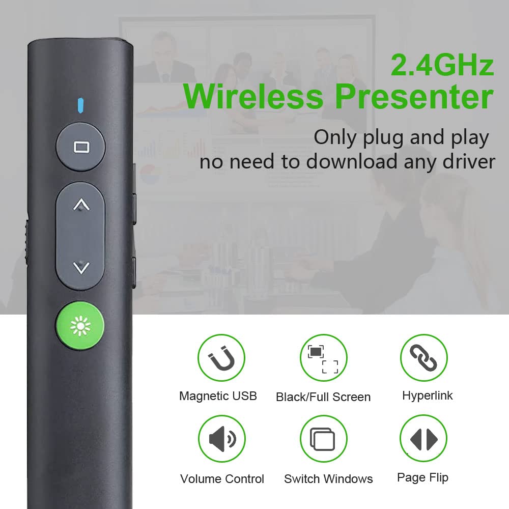 Présentateur Plug and Play sans fil : grâce à la technologie sans fil 2,4 G, il vous suffit de connecter un récepteur USB et vous pouvez faire votre merveilleux discours et présenter vos réalisations n'importe où dans la salle de classe ou dans la salle de conférence Connexion sans fil : récepteur radio USB, technologie sans fil 2,4 G. Pointeur Laser Récepteur 2.4 GHz Présentateur USB C, 2 En 1, Récepteur USB Et Type C, Pointeu Présentateur 2.4GHz Volume Plug and Play : le présentateur dispose d'une conception à double tête UBS+Type-C, ce qui facilite l'utilisation des haut-parleurs sur plusieurs appareils. Il doit être rechargé. La charge complète prend environ 2 heures et peut être utilisée normalement pendant environ 45 heures. Il suffit de le brancher sur l'USB du récepteur sans fil, aucun logiciel n'a besoin d'être installé. Ce clicker de présentation USB Type C 2 en 1 est un excellent outil pour tout présentateur cherchant à réaliser des présentations fluides et sans faille Garosa Récepteur Bluetooth USB Adaptateur Bluetooth 2 en 1 Récepteur Facile à utiliser : il vous suffit de suivre les instructions pour utiliser le présentateur multifonction qui prend en charge le plein écran/écran noir, la page précédente/la page suivante, le réglage du volume, la commutation de fenêtre/hyperlien. Forte compatibilité : Pointer for Presentation est compatible avec Windows 7/8/10 et supérieur, Mac ISO 3 et supérieur, Linux, Android 4., 3 ou supérieur, et peut être utilisé avec le logiciel PowerPoint, Keynote, Prezi, Google Slides pour faire défiler des pages Web et prend en charge plusieurs systèmes. Il suffit de brancher le récepteur USB et la configuration est très simple.