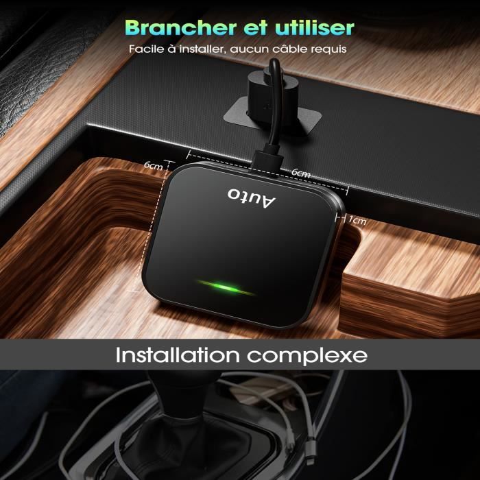 Quel que soit votre appareil, profitez d'une expérience de conduite fluide. Sa conception efficace de dissipation thermique garantit stabilità et fiabilità pour une utilisation longue durÃe., 3., Mode d'emploi : Branchez simplement adaptateur carplay sans fil sur le port Type-C/USB du vÃhicule, activez le Bluetooth et le Wi-Fi sur votre smartphone, puis recherchez le nom Bluetooth sur le terminal du vÃhicule. Nous vous rÃpondrons dans les 24 heures et vous proposerons la meilleure solution. Une fois appairé, votre smartphone Android se connectera automatiquement et en toute fluidité à Android Auto sans fil à chaque démarrage. SpÃcifications du produit : Nom du produit : Adaptateur sans fil 2-en-1 Android Auto et CarPlay Connexion : Bluetooth/Wi-Fi EntrÃe : Type-C Commande vocale : Smart Voice Sortie : Type-C/USB Utilisation : Plug and Play Modèles compatibles : Voiture d'origine compatible CarPlay. ADAPTATEUR SANS FIL CarPlay Sans Fil Android Auto Car Connect Box Performances 5G, expérience fluide : Adaptateur carplay sans fil adopte les dernières technologies de communication, prend en charge les réseaux Bluetooth 5., 2 et 5G, se connecte à votre téléphone mobile de manière stable et rapide, et offre une expérience fluide et sans latence pour la navigation, les médias et les commandes vocales pendant la conduite. Comparé aux modèles traditionnels, adaptateur carplay sans fil offre une connexion plus forte et plus stable, minimisant les interférences, éliminant les retards et évitant les interruptions de connexion, garantissant une expérience de conduite fluide et fiable. La technologie Bluetooth 5.0 et WiFi double bande assure une connexion stable et rapide, sans latence gênante. Navigation, appels mains-libres, musique... Convertisseur Sans Fil Pour Autoradio USB/Type-C Adaptateur Carplay Et Android Auto Sans Fil 2 En 1 Adaptateur Android Auto 2 En 1 Adaptateur CarPlay et Android Auto sans fil 2-en-1 : Adaptateur carplay sans fil convertit facilement un CarPlay filaire en une expérience sans fil, tout en conservant la connexion aux commandes d'origine du véhicule. L'appareil sera automatiquement dÃtectà et dÃmarrÃ. Envie de passer au sans fil dans votre voiture ? Cet adaptateur MSXTTLY transforme votre Android Auto ou Apple CarPlay filaire en connexion sans fil Pour des performances optimales, veuillez utiliser un smartphone Ãquipà d'iOS 10 ou d'une version ultÃrieure, ou d'Android Auto 11., 0 ou d'une version ultÃrieure. Adaptateur sans fil pour carplay et android auto dit adieu aux câbles encombrants et profitez du confort des appels mains libres. CaractÃristiques 1., Dimensions de adaptateur sans fil pour android auto et carplay : 5 x 2,5 x 1 cm. Son design élégant et compact s'intègre parfaitement à l'intérieur de votre véhicule sans gêner la vue.