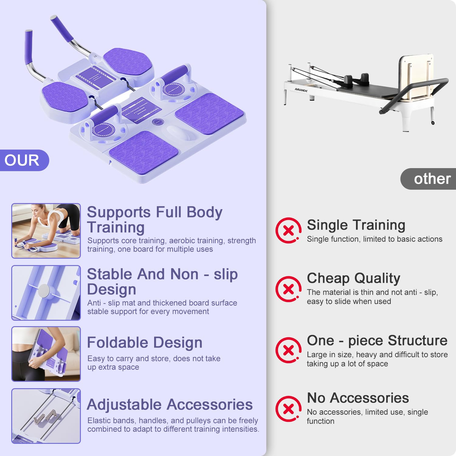 Adhérence exceptionnelle : avec des coussinets antidérapants : 30 % plus solides, cette planche abdominale multifonction reste stable, glisse uniformément, distribue bien la force, des entraînements plus sûrs. EN STOCK : Équipement de pilates avec rouleau abdominaux, mini machine de reformage portable, pompes, planche, ABS, entraînement de résistance pour homme et femme entraînement à domicile, RTN FR K0263 25122723 pas cher. Livraison rapide partout en France Aucun outil complexe nécessaire - Assemblage en 1 minute. Se replie à la taille mini 50 x 36 x 8 cm, se range sous les lits, économisant de l'espace dans la salle de sport. Parfait pour les routines de fitness à domicile. Entraînement Résistance Maison Reformer Pilates Portable - Entraîneur Abdos/Core Avec Rouleau Auto-Rebond, Bandes De Résistance & Planche Réglable - Fitness Domicile Mini Reformer Pilates Structure intuitive, manuel d'utilisation clair, s'adapte à tous les utilisateurs. Utilisation sans effort et modes polyvalents : super facile à utiliser, pas de courbe d'apprentissage. Prend en charge divers exercices : pompes, crunches, exercices de résistance, soulèvements de jambes, torsions du tronc. Disposition compacte, facile à manipuler, parfait pour l'exercice à la maison. Machine Exercice Abdo 4 En 1 Pliable Avec Rouleau Abdominal - Exercice Abdo, Fitness Maison Planche Pilates Matériau amélioré et pliage ultra compact : cette planche abdominale pliable, fabriquée en acier renforcé et ABS de qualité supérieure. achine de Pilates portable pour salle de sport à doicile – Planche de...