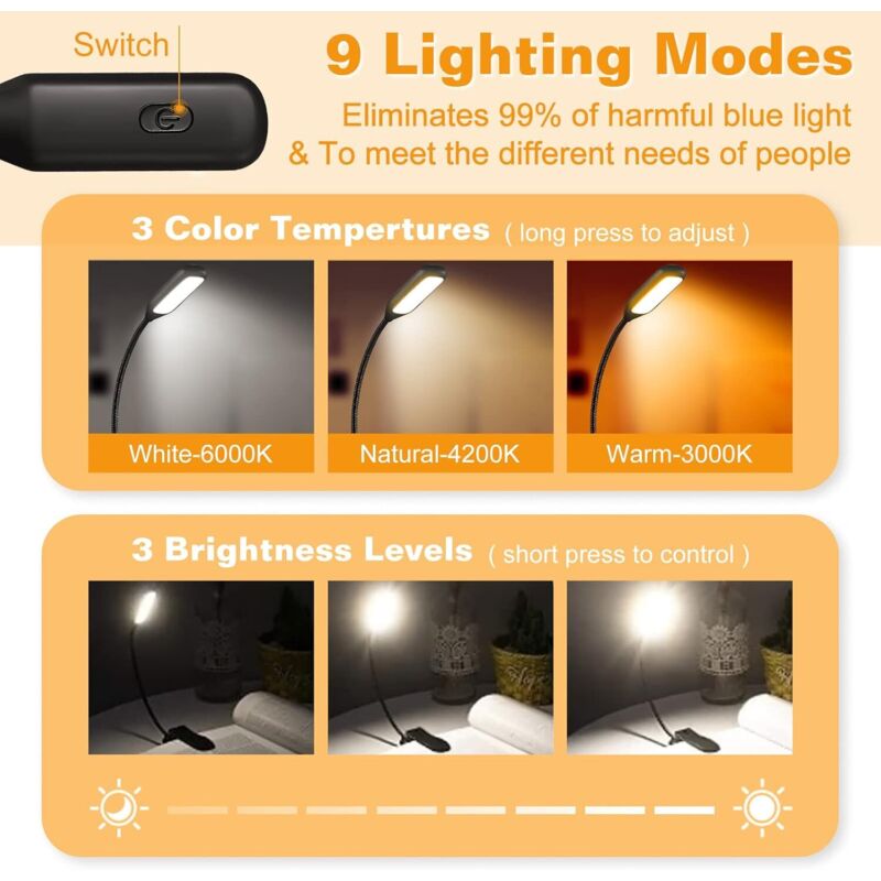 Design stable : cette lampe à pince se fixe en toute sécurité au lit, à la bibliothèque ou au bureau grâce à la fonction de serrage et de support. Col flexible et pince large et robuste] La lumière à clipser avec col de cygne souple à 360 ° pour régler l'angle de la lumière pour éclairer là où vous en avez besoin Fonctionnalités: Cette lampe de lecture dispose de 5 niveaux de réglage de la température de couleur, convient à différentes scènes et prend en charge le mode d'apprentissage Pomodoro, le retard de lumière de 60 secondes et d'autres fonctions., 1., Appuyez brièvement sur le premier bouton pour passer en mode lumière chaude. Elle peut être connectée à une banque d'alimentation, un ordinateur portable ou un bloc d'alimentation et est parfaite pour les déplacements, par exemple par exemple dans les hôtels, les trains ou le camping Col de cygne flexible à 360° et clip : la lampe de lecture entièrement rotative maintient chaque position avec un réajustement répété pour aligner précisément l'angle d'éclairage sur les pages du livre ou les surfaces de travail. Chaque mode dispose d'une fonction de gradation en appuyant longuement. Créez votre éclairage individuel pour vous détendre, vous concentrer ou travailler de manière créative sans distraction Lampe De Lecture À Pince, Lampe À Pince Pour Livre De Protection Des... Appuyez longuement sur ce bouton pour clignoter deux fois et passer en mode d'apprentissage Pomodoro. Lampe sur pied LED 600 lm à col de cygne et intensité lumineuse Lampe De Lecture à Pince Lampe De Bureau à Pince Col De Cygne Lampe De Lecture Pince De Lit Lampe De Lecture Rechargeable La distance de serrage est plus épaisse, plus stable et plus sûre et peut être fixée n'importe où Appuyez longuement pour régler la température de couleur directement sur le mode de lecture (niveau le plus clair)., 3., Appuyez brièvement sur le bouton de commutation pour allumer et éteindre et longuement pour régler la luminosité. Spécifications: Matériau : ABS., Couleur : blanc., Puissance nominale : 5 W. Alimentation : fonction de charge de type C 5 V. Contenu de l'emballage : 1 lampe de lecture.