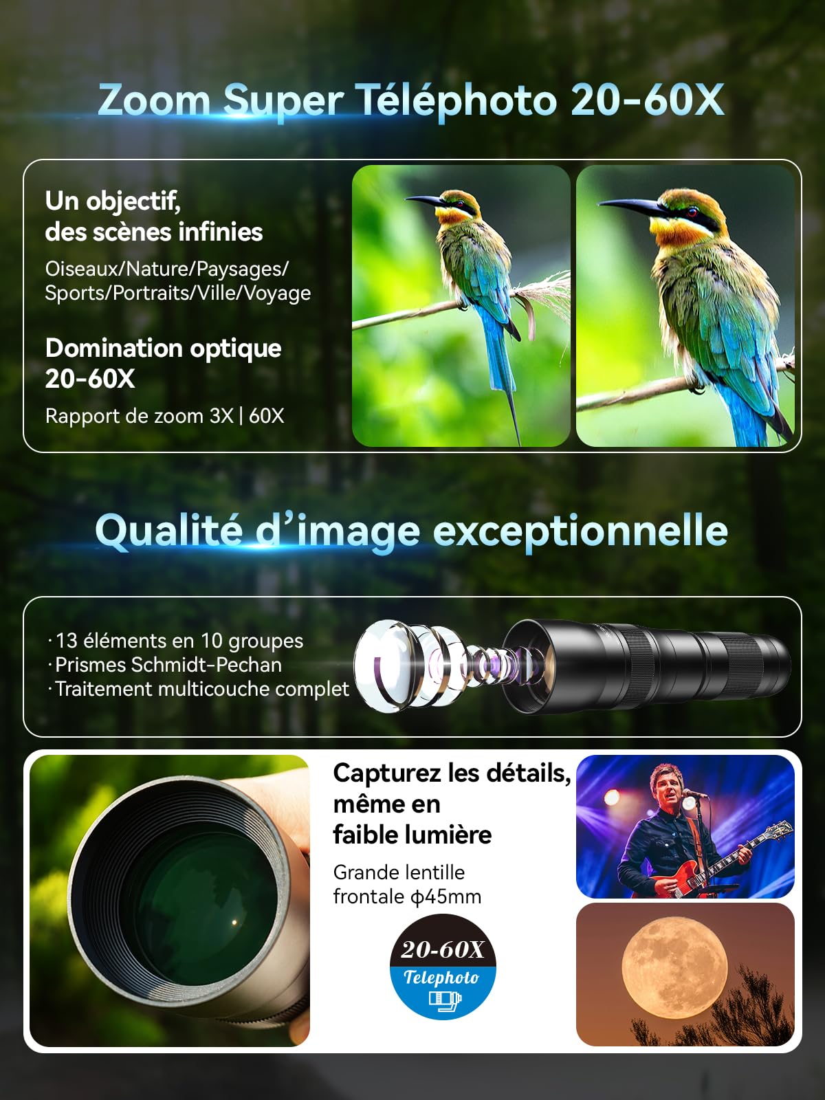 Contraste et résolution supérieurs pour des couleurs fidèles. Regardez des matchs sportifs : frissonnez devant l'expression nerveuse des athlètes ! Meilleur téléobjectif et objectif fisheye pour iPhone et Android Il se glisse dans votre poche et est facile à installer, à transporter et à ranger, vous permettant de prendre des photos pour une fête, un festival de musique, le camping, la randonnée, les voyages, l'observation des oiseaux, etc., et de conserver tous vos merveilleux souvenirs Prise de vue flexible à main levée/sur trépied-Sa conception légère permet la prise de vue à main levée, vous permettant de capturer rapidement des corps célestes et des paysages lointains (pratique pour l'observation des oiseaux et les voyages). Evil eye Téléobjectif avec zoom 20-60x, objectif de téléphone Le trépied inclus est réglable en hauteur, garantissant une prise de vue stable, même pendant de longues périodes d'observation, sans fatigue. Utilisez les filtres ND pour capturer des paysages diurnes ou améliorer le contraste pour observer la lune. Zoom Canon Eos 2000d Evil Eye Zoom Téléobjectif 20-60X Telephoto Objectif Haut Zoom Telephone Portable Téléobjectif mobile haute qualité-Doté d'un grand objectif de 45 mm, d'une construction de lentille composite haute définition de 13 éléments en 10 groupes, de lentilles entièrement multicouches et d'un prisme de Schmidt recouvert d'un alliage d'argent, cet objectif optique de haute qualité atteint une transmittance supérieure à 99,5 %, une réflectivité d'environ 95 % et une faible distorsion de 4 %. Obtenez facilement le zoom parfait, difficile à obtenir avec un zoom fixe. Suivez les performances scolaires de vos enfants : sympathisez avec leur travail acharné.