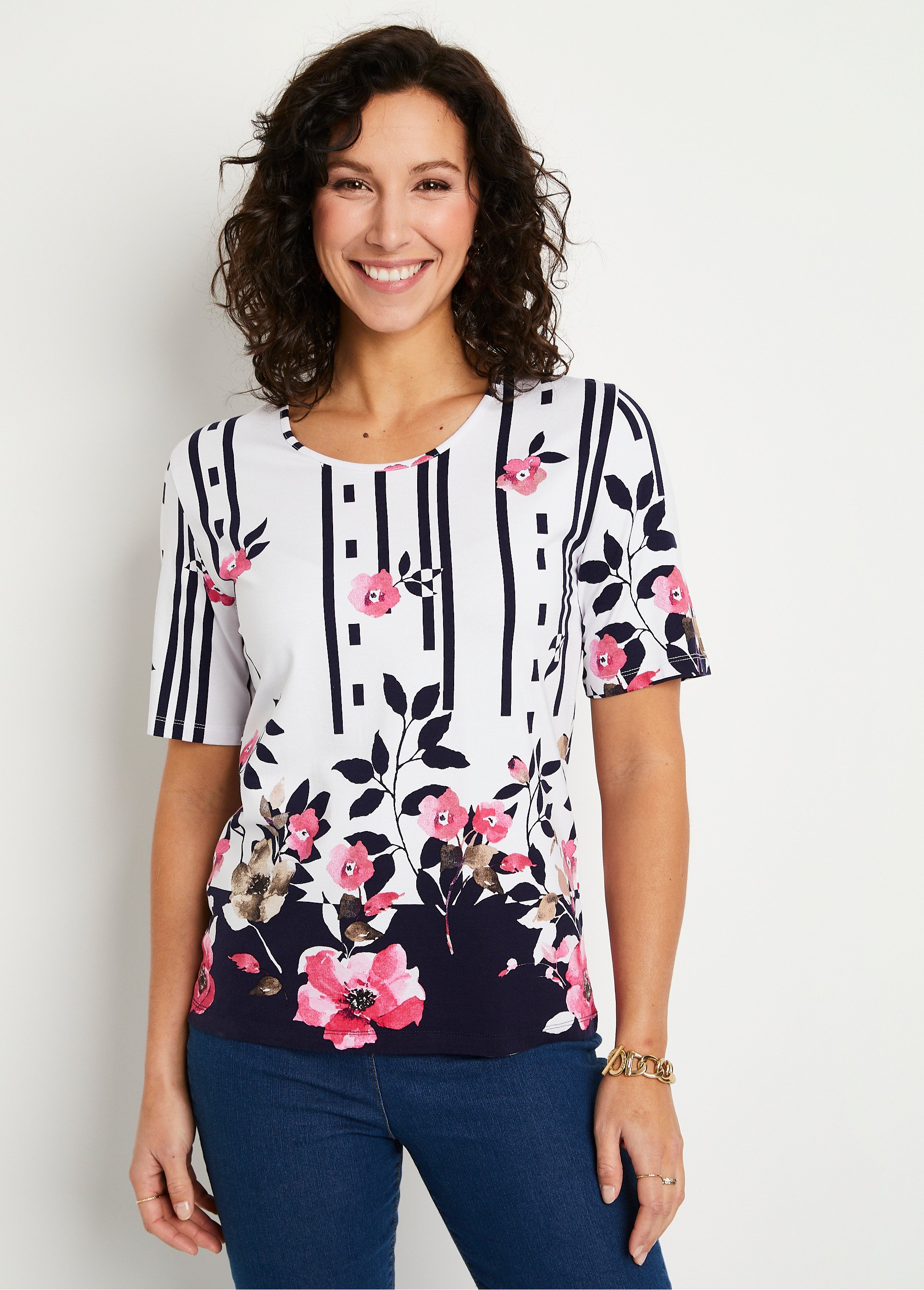 Il sublime autant un jean décontracté, qu'un pantalon citadin ou une jupe féminine., ., ., Avec son imprimé patchwork lumineux, le T-shirt femme est une transition facile entre été et automne. Parfait pour un quotidien moderne et confortable, le T-shirt imprimé se décline en plusieurs tonalités pour s'associer à tous vos bas préférés. Une pièce confort à porter seul durant les beaux jours, et sous un gilet par la suite., Extensible. Pantalon imprimé taille élastiquée Noir Matières : 94% Viscose, 6% Elasthanne T-shirt irisé manches courtes col rond Violet | Afibel T-shirt Femme Viscose T-shirt Imprimé Effet 2-en-1 En Maille Rouge T-shirt Col Rond Manches 3/4 Le t-shirt imprimé est parfait pour un usage quotidien moderne et confortable et est disponible dans une variété de couleurs pour correspondre à tous vos...