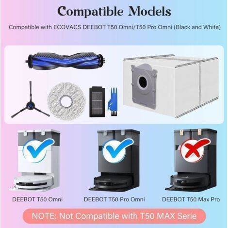 Maintenir efficacement le travail de nettoyage quotidien des robots Kit de Remplacement pour DEEBOT T50 MAX Family - FR Contenu de l'emballage : kit d'accessoires pour robot Ecovacs Deebot T50 Pro Omni/T50 Omni/T50 Pro, comprenant 1 brosse principale, 4 serpillères, 4 sacs à poussière, 4 filtres HEPA, 4 brosses latérales Filtration Efficace - Les T50 Pro Omni sacs à poussière et les filtres HEPA ont une conception de filtration multi-couches qui ajoute une filtration au charbon actif qui peut bloquer toute la poussière tout en absorbant efficacement les odeurs désagréables Alors que la brosse latérale pénètre profondément dans les coins et les bords pour éliminer encore plus de taches et de poussière La grande capacité retient les déchets, les cheveux et la poussière pour un sol propre comme neuf Contenu de l'emballage - Kit d'accessoires pour Ecovacs Deebot T50 Pro Omni/ T50 Omni/ T50 Pro, comprenant 1 brosse principale, 6 serpillières, 4 sacs de poussière, 4 filtres HEPA, 4 brosses latérales et 1 outil de nettoyage. Anti Enchevêtrement - Conçue avec un rouleau en spirale en forme de V de précision, la T50 Omni brosse principale empêche les cheveux de coller et élimine le nettoyage manuel fréquent des cheveux enchevêtrés sur la brosse, tout en nettoyant efficacement toutes sortes de poussières Brosse Principale Aspirateur Robot Kit D'Accessoires Pour Ecovacs Deebot T50 Pro Omni/ T50 Omni Produit Ecovacs