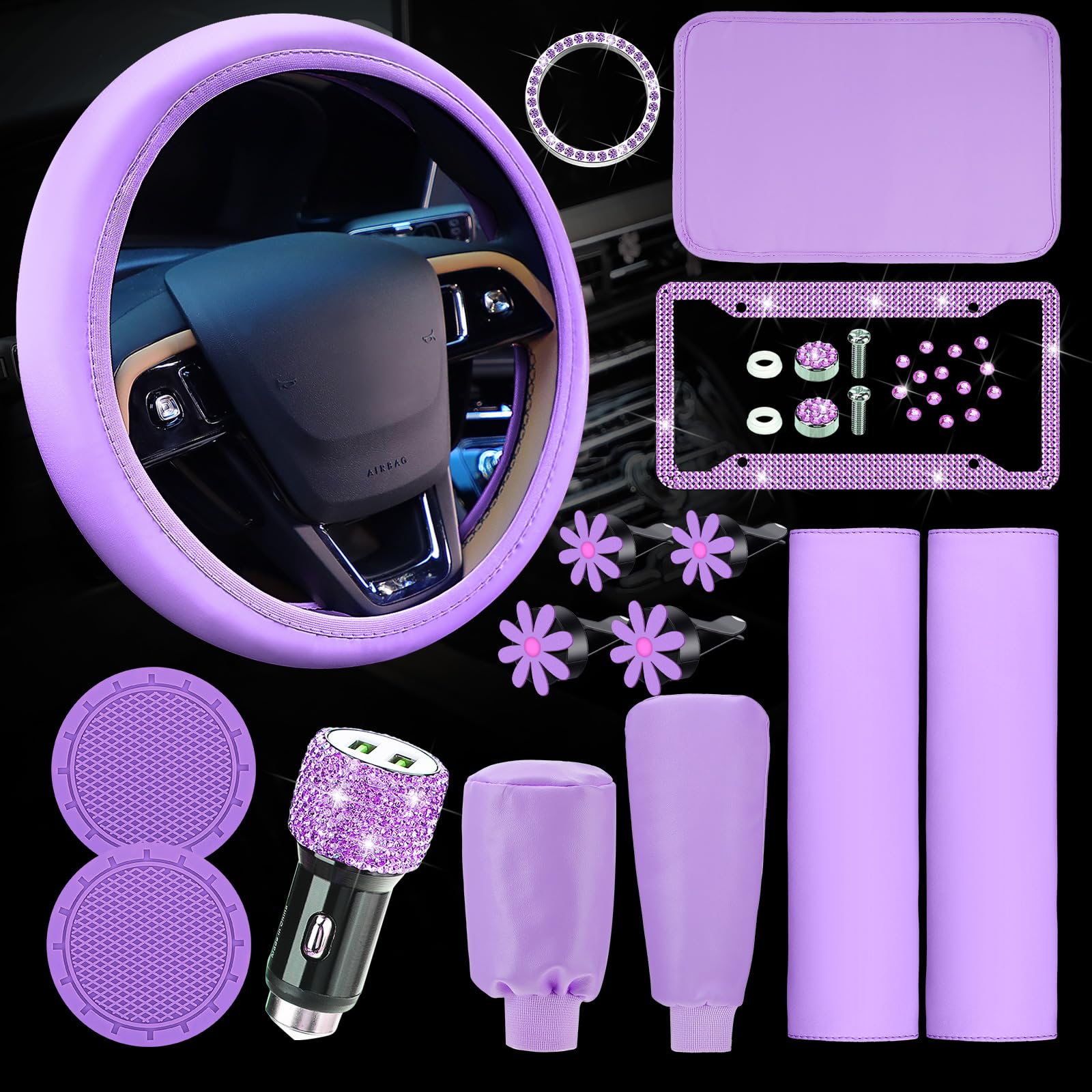 Accessoires Auto Violet Strass Support Verre COUVRE-VOLANT,style 6--housses De Volant De Voiture En Cuir Suédé Noir, Personnalisées, Pour Supports Verres Silicone Personnalisez l'intérieur de votre véhicule : ce lot comprend 10 accessoires essentiels qui vous permettent d'ajouter une charmante touche de couleur et de style à l'intérieur de votre voiture, idéal pour ceux qui aiment l'esthétique féminine. FYDUN Coussinets anti-vibrations Lot de 4 Rehausseurs de Meubles de 10... Kit de 10 housses de volant avec coussinets de ceinture de sécurité chics, supports de voiture robustes et autocollant en strass pour décoration de véhicule personnalisée (noir *Couleur : rose, noir, violet. Housses de ceinture de sécurité pour plus de confort : mesurant environ 22,9 x 22,9 cm, ces housses sont conçues pour le confort pendant les longs trajets et s'attachent facilement sans causer de restriction. Housses de Volant en Cuir Bleu pour Femme Accessoires de Voiture Mignons avec Ceinture de 4 clips pour grille d'aération de voiture. Caractéristiques : * Ensemble complet d'accessoires : ce paquet comprend 10 accessoires essentiels de voiture, offrant tout ce dont vous avez besoin pour personnaliser et améliorer l'intérieur de votre véhicule avec un ravissant thème de couleur, parfait pour ajouter une touche féminine. * Housses de ceinture de sécurité confortables : conçues pour le confort, les housses de ceinture de sécurité sont faciles à attacher et soulagent l'inconfort pendant les longs trajets, mesurant environ 7,4 x 22,9 cm pour s'adapter parfaitement sans être restrictif. Taille : comme sur l'image. *Supports de voiture : fabriqués à partir de silicone de haute qualité, ces supports sont robustes et fiables, ils restent en place tout en maintenant vos articles en toute sécurité, que ce soit dans la voiture ou à la maison. 2 coussinets d'épaule pour ceinture de sécurité., 2 dessous de verre. * Compatibilité haute universalité : oui. * Housse de volant élégante : la housse de volant attrayante protège non seulement contre l'usure, mais apporte également une touche amusante et élégante à votre expérience de conduite, s'adapte à la plupart des volants entre 36,8 et 39,4 cm de diamètre.