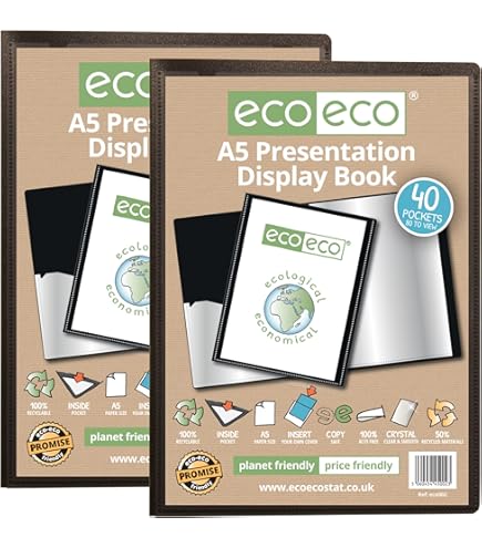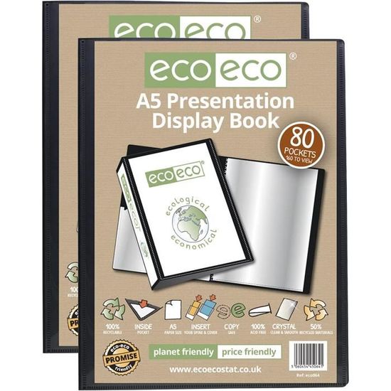 Lot de 6 pochettes polypropylène recyclé A5 - Assortis - Etuis Couverture noire résistante de 600 microns avec pochette transparente de 160 microns format A6 sur la couverture avant pour personnalisation et présentation Porte Vu Pochette Art Plastique Eco-eco Eco089x2 Lot De 2 Porte-documents A5 50 % Recyclé Avec e Avec Pochette Devant Classement Documents écologique Couverture noire résistante de 600 microns avec pochette transparente de 160 microns format A6 sur la couverture avant pour personnalisation et présentation. Un total de 40 pages (80 côtés à vue) reliées en toute sécurité pour un classement optimal et polyvalent Ces pages peuvent contenir des documents A6 en toute sécurité Un total de 40 pages (80 côtés à vue) reliées en toute sécurité pour un classement optimal et polyvalent. Les pages de 50 microns sont sans acide, lisses, transparentes et sans danger pour la copie Porte-vues 40 Pages Lot De 2 Protège-Documents Eco-Eco A5 - 40 Pages - 50% Recyclé - Pochette Transparente Rangement Feuilles Transparent Les pages de 50 microns sont sans acide, lisses, transparentes et sans danger pour la copie. Poche de rangement supplémentaire transparente à l'intérieur de la couverture avant pour ranger des articles et documents en vrac Poche de rangement supplémentaire transparente à l'intérieur de la couverture avant pour ranger des articles et des documents en vrac.