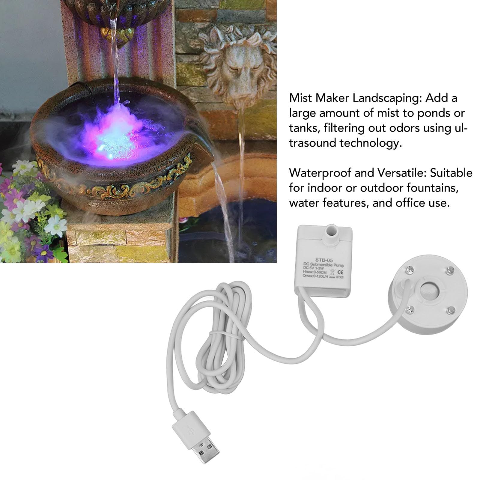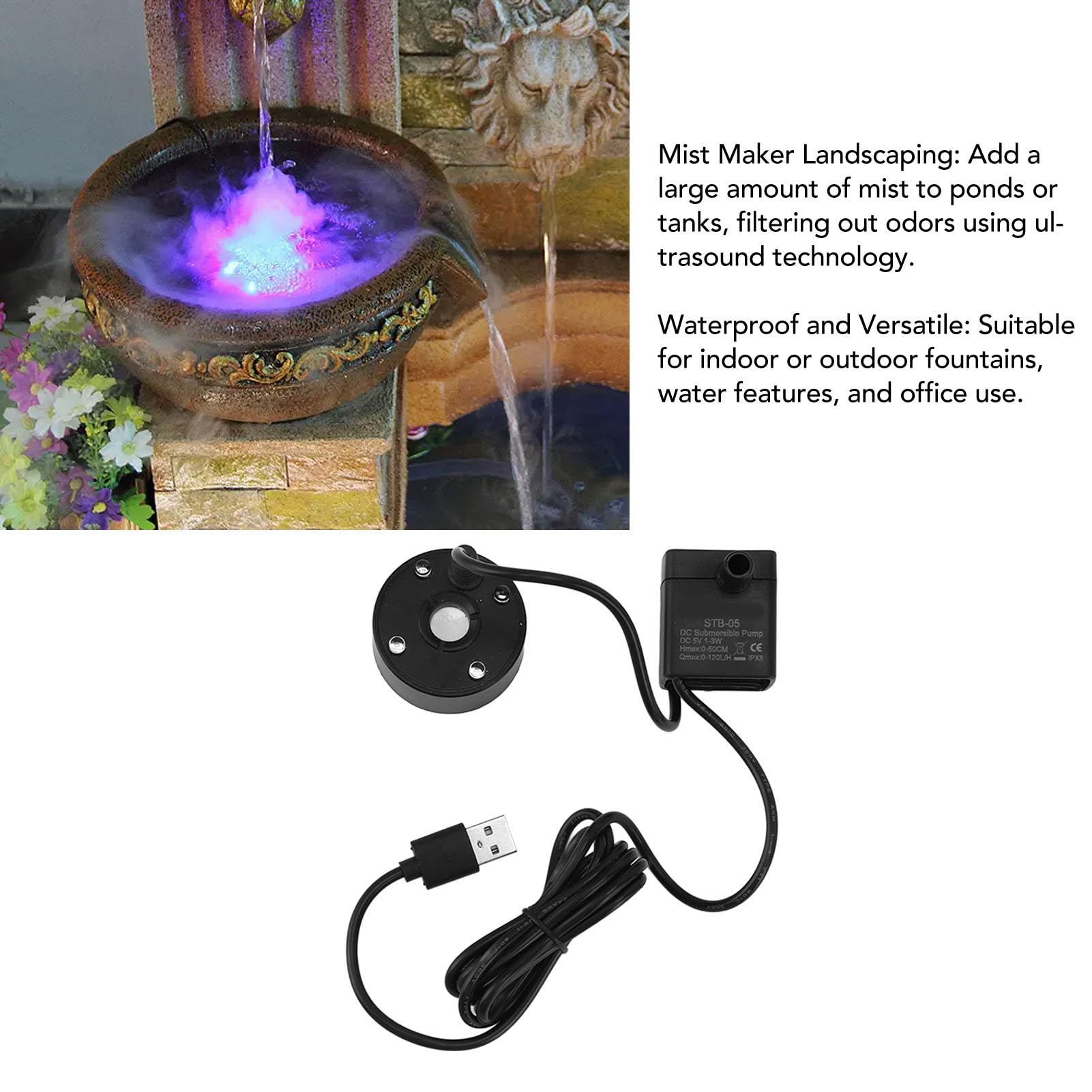 Brumisateur USB Brumisateur De Pompe à Eau USB 5V, Avec Machine à Brouillard LED, Lumières Colorées Pour Fontaine, Jardin, Rocaille, Aquarium Humidificateur Intérieur Effet Brouillard Appareil multifonction : cet atomiseur à pompe à eau fusionne la génération de fumée avec un éclairage LED coloré en une unité compacte (8, 34, 30 mm), ce qui le rend pour les fêtes et événements. Mini ventilateur brumisateur USB portable avec brumisateur de... Aquarium pour Tortue d'Eau avec Pompe à Eau Intégrée - Univers Tortue * Lumières colorées vives : les lumières colorées intégrées ajoutent un élément visuel à l'effet de fumée. Design convivial : pour fonctionner, il suffit de placer l'appareil dans l'eau, de le connecter à l'alimentation, et d'appuyer sur un bouton pour commencer à générer du brouillard avec un éclairage vibrant. Pompe à eau 3W avec lumières Led, 4 couleurs diffé... - Grandado Caractéristiques : * Nom du produit : atomiseur à pompe à eau tout-en-un *Matériau : plastique. La taille du produit est de 37,8 x 34 x 30 mm. Il suffit de le placer dans un port USB pour profiter de l'effet fumée. Créez une expérience atmosphérique et immersive pour votre événement ou spectacle. * Capacité de génération de brume : avec l'aide de la pompe à eau intégrée, cette machine est capable de générer de la fumée en peu de temps. Il suffit de placer la machine dans l'eau, de connecter l'alimentation électrique et d'appuyer sur le bouton pour commencer à générer de la fumée et activer les lumières colorées. Il offre une variété de couleurs et de modes d'éclairage, vous permettant de personnaliser l'atmosphère selon vos préférences. * Alimenté par USB : cette machine à fumée est alimentée par une alimentation USB de 5 V, facile à utiliser et compatible avec une variété d'appareils.