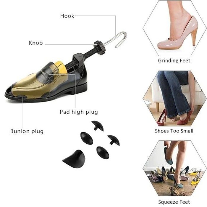 ÉTIREUR DE CHAUSSURES DURABLE : étireur de chaussures fabriqué en plastique de haute qualité et en acier inoxydable robuste pour garantir la durabilité du produit et une longue durée de vie. Contenu de l'emballage : 1 embauchoir 4 bouchons pour oignons Placez ecarteur chaussure dans la chaussure, puis tournez la poignée métallique dans le sens des aiguilles d'une montre pour élargir la pointe. Tournez la molette en plastique pour allonger la chaussure. Les résultats sont visibles après 18 à 24 heures Prévient la douleur et les ampoules – rend les chaussures plus confortables · Ajustement réglable – facile à régler avec une vis rotative · Étirements spécifiques... Il est préférable d'utiliser l'embauchoir dans vos nouvelles chaussures ou vos anciennes chaussures trop serrées. Embauchoirs à chaussures - BIGILANTUH - Taille M - Bois naturel REMARQUE : la taille de cet embauchoir est de 40 à 46 (universel pour les hommes et les femmes dans l'Union européenne). Ce produit ne peut être utilisé que pour les chaussures plates, et non pour les bottes et les talons hauts ! Embauchoir Chaussures élargisseur Allongeur Embauchoir Plastique, Elargisseur Chaussure, Embauchoirs à Chaussures, Facile à Utiliser Durable Agrandisseur Chaussures Plastique ÉTIREUR DE CHAUSSURES RAPIDE : ces étireurs de chaussures augmentent non seulement la longueur et la largeur, mais peuvent également soulager les points de pression grâce à leur conception spéciale qui offre un confort absolu aux pieds. Ne laissez pas vos chaussures neuves frotter vos pieds pendant quelques semaines ! Méthode d'utilisation : 1., Insérez les embauchoirs dans les chaussures., 2., Pour allonger : tournez la poignée dans le sens des aiguilles d'une montre jusqu'à ce que la pression s'affiche sur la chaussure., 3., Pour allonger : tournez la manivelle métallique dans le sens des aiguilles d'une montre jusqu'à ce que la pression s'affiche sur la chaussure., 4., Pour un résultat optimal, laissez les embauchoirs en place pendant au moins 24 heures., 5., Retirez les embauchoirs de vos chaussures : tournez les poignées dans le sens inverse des aiguilles d'une montre.