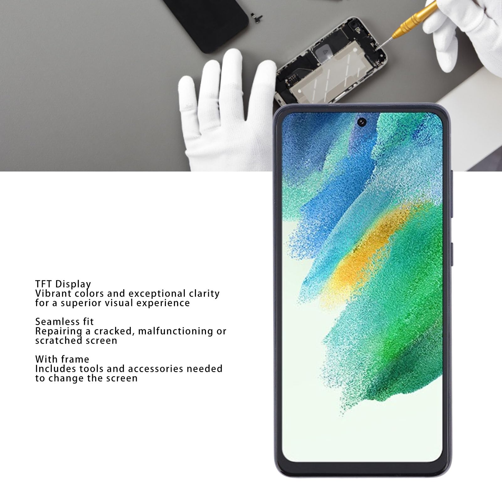 Spec: Type d'article: Remplacement de l'écran du téléphone Matériel: TFT Application: pour S21 Fe 5G Modèle compatable: pour SM G990B, SM G990U, SM G990U1, SM G990B, SM G990U, SM G990U1, SM G990B G990W, SM G990E, SM G990N Taille d'affichage de l'écran: 6,4 pouces Résolution: 1080x2400px Pixels Density: 411ppi Comment utiliser: Out of the Box Liste des paquets: 1 x Écran Bar 1 x tasse d'aspiration Remarque: sans fonction d'empreinte digitale Choix idéal pour remplacer l'écran d'origine., 2., Écran de 6,4 pouces avec haute résolution: avec un écran de 6,4 pouces avec une fonctionnalité multi-touch et tactile sensible 3D, offrant une résolution de 1080x2400px et 411 pixels de la densité pour une luminosité élevée, une saturation des couleurs et une large gamme de couleurs., 3., Écran LCD TFT: L'assemblage de l'écran tactile LCD TFT subit des tests QC rigoureux avant l'expédition, une expérience tactile plus fluide. Remplacement de qualité d'origine 1:1 : reproduit toutes les caractéristiques de l'écran LCD d'origine, y compris la qualité d'affichage, la résolution et la sensibilité tactile, offrant une qualité d'image sans scintillement et une meilleure protection visuelle TD® Convient pour OnePlus 7 écran noir écran LCD écran tactile... Compatibilité: ce remplacement d'écran est précisément adapté à S21 FE 5G SM G990B, SM G990U, SM G990U1, SM G990W, SM G990E, SM G990N Smartphones. Remplacement d'écran Écran tactile OLED Galaxy A51 - Kit d'outils de Choix idéal pour remplacer l'écran d'origine. Idéal pour divers défauts d'écran: idéal pour remplacer les écrans par des problèmes tels que une réponse incorrecte, des problèmes d'affichage, une distorsion des pixels, une touche insensible, des fissures d'écran, des inexactitudes de couleurs, un vieillissement d'écran, des pixels morts ou un gel. écran Samsung S21 Fe 5g Asixxsix Kit De Remplacement D'écran Tactile De Téléphone S21 FE 5G SM G990B, Remplacement D'écran Facile, Numériseur D'écran Tactile, Assemblage Complet Avec Cadre Et Outils De Réparation écran Haute Résolution 1080x2400 Utilisation d'une excellente technologie d'affichage pour garantir un écran d'épreuve sans rayures sans points morts, pixels ou lignes., 4., Idéal pour divers défauts d'écran: idéal pour remplacer les écrans par des problèmes tels que une réponse incorrecte, des problèmes d'affichage, une distorsion des pixels, une touche insensible, des fissures d'écran, des inexactitudes de couleurs, un vieillissement d'écran, des pixels morts ou un gel., 5., Installation professionnelle avec outils: est livré avec une trousse d'outils de réparation, mais il est recommandé de faire en sorte qu'un réparateur professionnel de gérer l'installation pour éviter d'endommager le téléphone. 1., Compatibilité: ce remplacement d'écran est précisément adapté à S21 FE 5G SM G990B, SM G990U, SM G990U1, SM G990W, SM G990E, SM G990N Smartphones. Veuillez confirmer la version de votre téléphone avant l'achat.