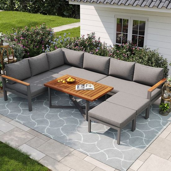 LINKHOO Salon de Jardin Exterieur 6/7 Personnes,Ensemble de Meubles en rotin,canapé d'angle avec Structure en Fer galvanisé,Pieds réglables,y Compris Tous Les Coussins d'assise et de Dossier,Gris Le traitement spécial contre l'humidité évite la rouille, assurant ainsi une robustesse et une stabilité accrues, même sous des conditions climatiques difficiles. Ensemble Jardin Avec Coussins Gris Ensemble De Salon De Jardin, Ensemble De Meubles Pour 6-7 Personnes, Incl. Coussins D'assise Et Salon De Jardin 6 Places Canapé D'angle Le cadre en fer galvanisé est résistant à la corrosion et durable. Grâce à ses propriétés respirantes, il vous offre un confort optimal pendant les journées chaudes tout en respectant l’environnement. 【Polyvalence pour Toutes Occasions】:Que ce soit pour un repas en famille, une réunion d'affaires ou une soirée cinéma entre amis, ce salon de jardin 6 places s’adapte à toutes vos envies et à tous vos espaces extérieurs, du jardin à la terrasse. Couleur. Gris ; Marque. LINKHOO ; Taille. 61 cm x 120 cm x 69 cm ; Assemblage requis. Non ; Dimensions de l'article L x l x H · 120 x 61 x 69 centimètres Rio Salon de jardin | IRIKO TREE | Orange - Moderne Emob | Emob 【Structure Solide et Résistante】:Fabriqué avec une armature en fer galvanisé, le canapé d'angle est conçu pour durer. 【Matériaux Écologiques et Respirants】:Le salon de jardin d'angle est fabriqué à partir de rattan naturel, un matériau renouvelable et éco-responsable. Idéalpour les espaces extérieurs tels que les jardins, balcons et terrasses, son designrespirant assure le confort, tandis que les pieds réglables des tables et chaisesgarantissent la stabilité sur les surfaces inégales., 1., Caractéristiques du produit : Matériau : Métal, rotin Couleur : Gris Dimensions : Grand canapé*2 : 120*61*69 cm Petit canapé*1 : 61*61*69 cm Banquette : 50*40*41 cm Table : 90*55*41 cm Poids : 59., 7 kg Charge maximale : 150 kg/place individuelle, 60 kg/table Emballage : 3 paquets Assemblage requis : oui 2., Scénarios d'utilisation à domicile: L'ensemble est parfait pour les espaces extérieurs tels que les jardins, balcons outerrasses, idéal pour se détendre en famille ou entre amis., 3., Design unique: La combinaison de rattan écologique et de fer galvanisé offre une structureélégante, respirante et résistante à la corrosion, garantissant à la fois confortet durabilité.