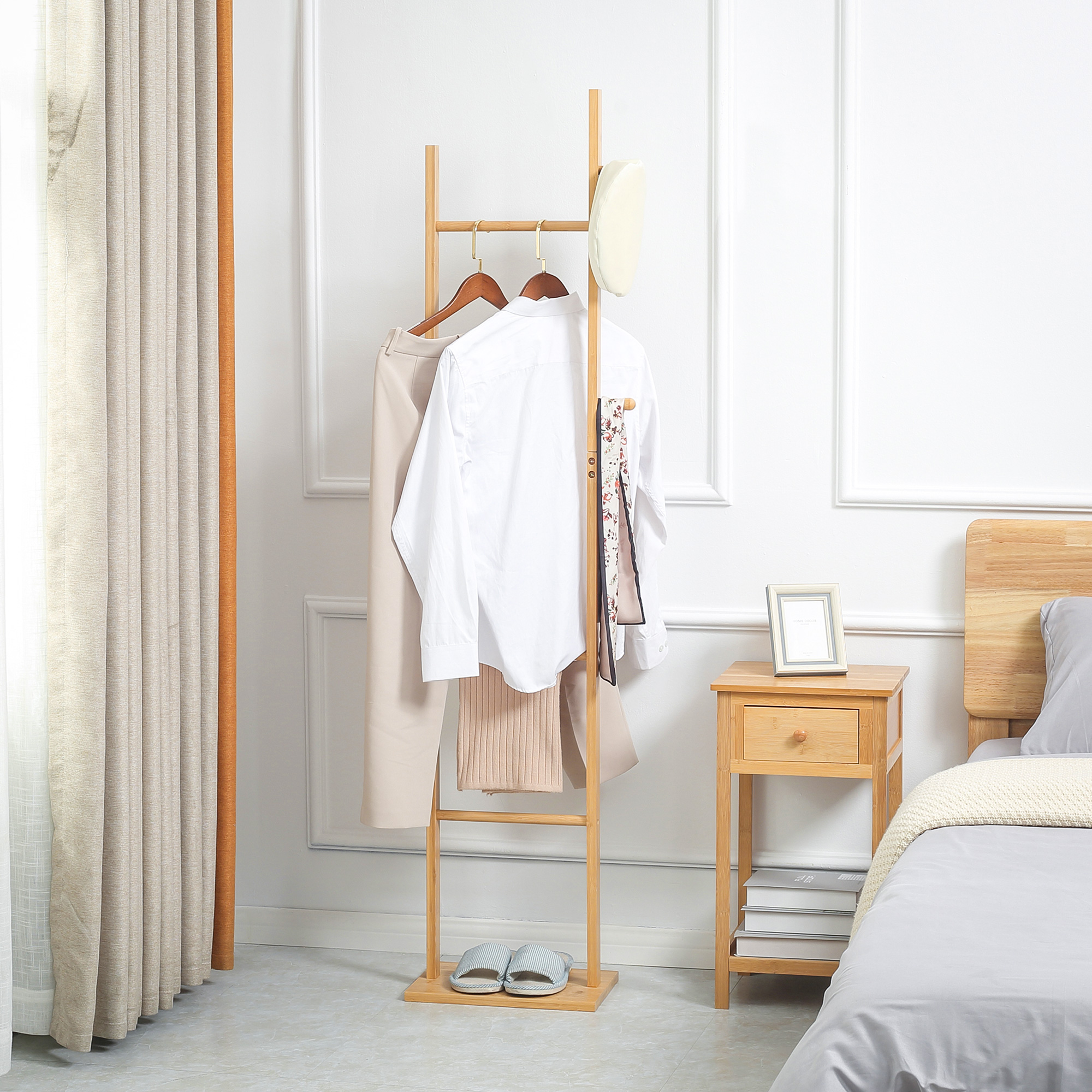 Fourni avec 3 barres et 2 crochets pour vos vêtements, chapeaux, sacs et écharpes Il se compose d'un cadre en bambou avec une finition naturelle qui donne au porte-manteau un style contemporain, adapté aux chambres, aux bureaux, aux couloirs ou aux entrée. Il comprend 2 crochets et 3 rails pour ranger soigneusement vos vêtements et vos sacs. recommandée : 5 kg (sur chaque barre), 3 kg (sur chaque crochet) ; - Meuble d'entrée à monter soi-même Il s'harmonisera facilement avec le reste de votre mobilier Porte-manteau Design Moderne Pour Entrée Homcom - Porte Manteau Sur Pied Vestiaire Bois Naturel Porte Manteau Mural Conception verticale, idéale pour les espaces limités dans les entrées, les chambres et autres , Assemblage requis totales : 36L x 24l x 168H cm ; - Charge max. Porte-manteau au design moderne qui s'harmonisera avec la décoration de votre intérieur Conception innovante Nous travaillons dur pour créer des articles pratiques, tendances et innovants qui peuvent passer l'épreuve du temps et vous aider à mieux vivre. Découvrez le porte-manteau HOMCOM qui organise parfaitement vos matinées trépidantes avec crochets, tiroirs et rayonnage pour chaussures. Sa structure en acier et son design anti-basculement garantissent sécurité et durabilité Description du produit Ce portant à vêtements sur pied pratique de HOMCOM est parfait pour suspendre vos vêtements et autres accessoires tels que chapeaux, parapluies et sacs. Porte-vêtement pour entrée composé de 2 crochets et de 3 tringles Chaque produit a été testé à plusieurs reprises tout au long du processus de production pour nous assurer qu'il soit robuste. HOMCOM propose une grande sélection de meubles et accessoires déco, tendance et accessibles, pour permettre à chacun(e) de trouver son bonheur. Porte Manteau sur Pied Bois et Métal | Mon Porte Manteau HOMCOM Porte-manteaux sur ped 2 en 1 5 crochets 2 étagères desgn Fabriqué en bambou solide avec une base stable pour une utilisation fiable