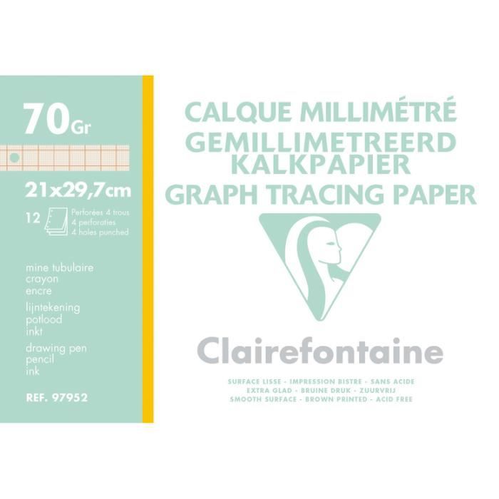Canson Blanc Papier Calque Clairefontaine - Pochette 12 Feuilles A4 - 90g - Hautement Transparent - Pour Dessin Technique Papier Calque A4 Pochette de calque millimétré, 70/75g12 feuillesformat A4 : 21 x 29,7 cm Pochette de calque millimétré, 70/75g12 feuillesformat A4 : 21 x 29,7 cm Format : A4 (21 x 29,7 cm). ; Grammage : 70/75 g/m². ; Nombre de Feuilles : 12 feuilles par pochette. ; Conditionnement, 1 ; Emballage produit, 10... Feuille Calque 70g Clairefontaine Pochette Calque Millimétré A4 12 Feuilles 70/75g Papier Calque 90g format A4 : 21 x 29,7 cm