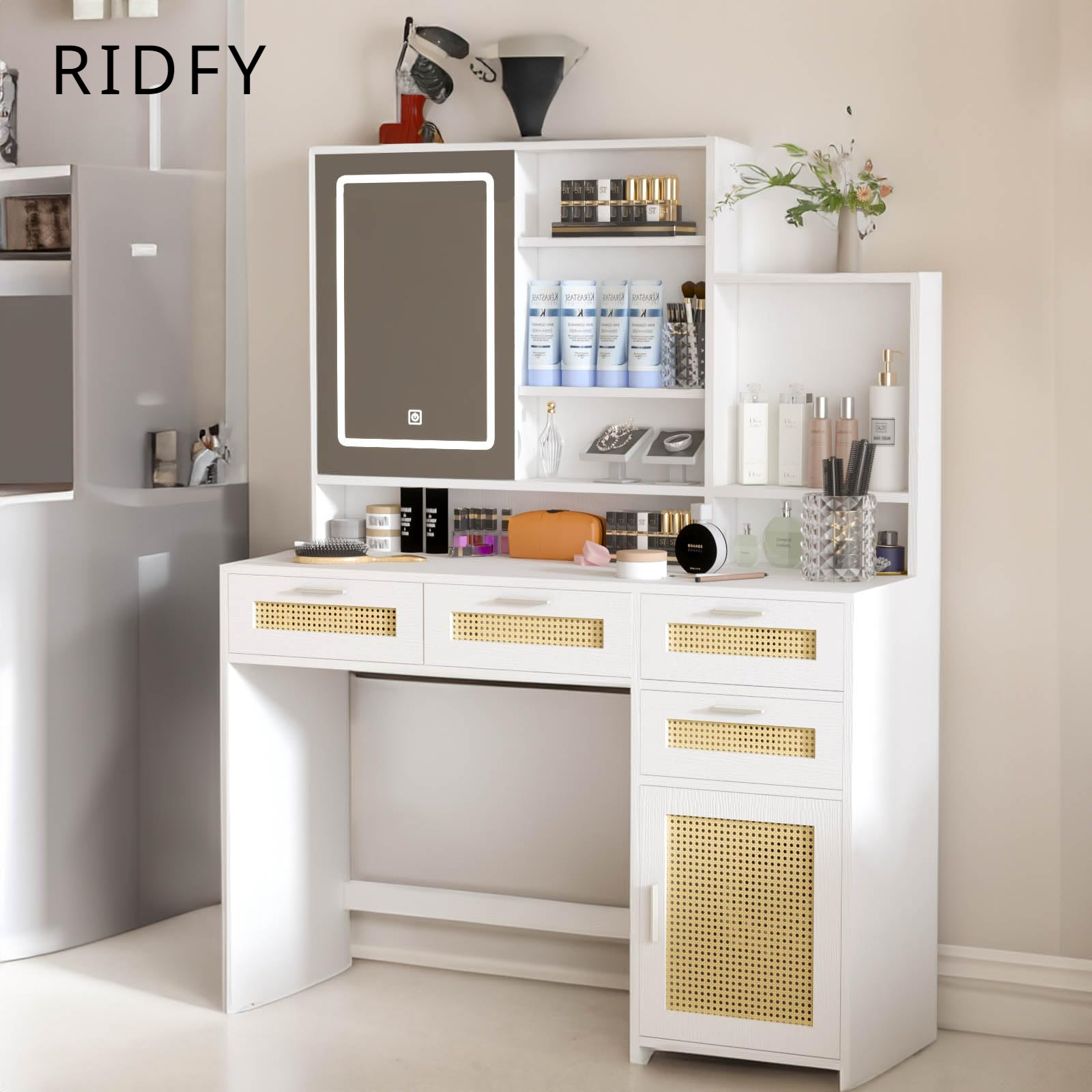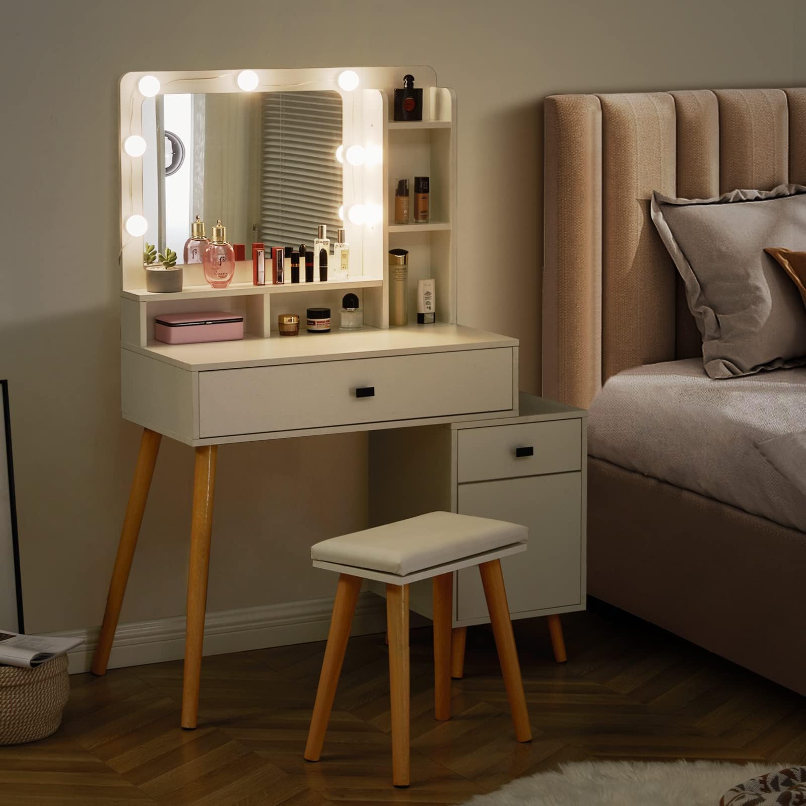 Coiffeuse avec Miroir LED et Tabouret, Table de Maquillage Lumière et Luminosité Réglable, Station de Recharge, Étagère, 64 x 40 x 132 cm (Blanc Vous pouvez facilement changer la couleur et l'intensité de la lumière. Coiffeuse Pas Cher Reukmuuc Bureau De Maquillage, Miroir éclairé Par LED Avec 3 Modes De Luminosité Réglables, 4 Tiroirs Et étagères Ouvertes, Coiffeuse De Chambre Moderne, Blanc Blanc Bureau Coiffeuse Grand espace de rangement : la coiffeuse soigneusement conçue offre un espace de rangement généreux avec plusieurs tiroirs et étagères ouvertes qui peuvent facilement contenir tous vos cosmétiques et accessoires. Toutes les pièces sont clairement numérotées et étiquetées, ce qui rend l'assemblage facile et rapide afin que vous puissiez rapidement profiter de votre nouveau meuble Si vous avez des questions ou des préoccupations, vous pouvez contacter notre équipe de service client à tout moment. Miroir multifonction : Le miroir éclairé par LED tricolore ajuste la luminosité selon vos besoins, offrant un éclairage optimal et garantissant que chaque application de maquillage soit parfaitement reflétée, mettant en valeur chaque détail Coiffeuse Avec Miroir, Table De Maquillage Avec Éclairage LED Éclairage réglable : le miroir de maquillage est équipé de 10 ampoules hollywoodiennes et offre 3 modes de couleur : jaune chaud, blanc chaud et blanc froid. Le miroir lumineux crée l'environnement idéal pour votre maquillage Qu'il s'agisse de biberons, de boîtes ou d'outils de maquillage, tout reste bien rangé et vous aide à garder votre chambre bien rangée