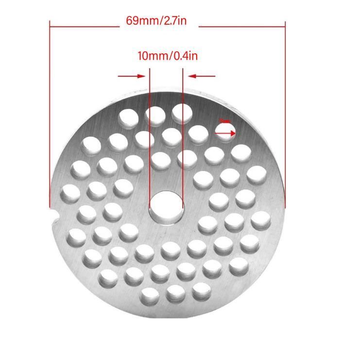 Disque à Trous Hachage Lame De Disque à Trous, à Disque En Acier Inoxydable Avec Trous De 10 Mm | Pour Affûteur Hachoir Bosch, Zelmer, Chambre Numéro 8 – 61 Mm Hachoir à Viande Nettoyage facile : après avoir utilisé le disque perforé, le matériau lisse et résistant peut être nettoyé avec de l'eau chaude et du liquide vaisselle doux. Grille Plaque pour Hachoir à Viande N° 8 (Diamètre des Trous: 10 mm)119... Découvrez notre large sélection d'accessoires pour les hachoirs à viande Reber (couteaux, entonnoirs, carrés d'hélices et entonnoirs pour la réalisation de saucisses maisons - Diamètre du disque perforé : Ø 7 cm. | Compatible avec tous les hachoirs à viande d'un diamètre de 7 cm Plaque perforée pour hachoir à viande - 0,45 cm - Hendi - 282243 Utilisation : les couteaux à disque peuvent être facilement fixés à votre hachoir à viande. Mahlzeit Disque perforé en acier inoxydable Ø 10 mm, pour hachoir à viande professionnel, Ø 7 cm Le disque perforé Mahlzeit s'adapte parfaitement à tous les hachoirs à viande d'un diamètre de 7 cm. Grâce à l'anneau de fixation facile à ouvrir, le disque peut être changé en un tour de main. Diamètre du disque perforé : Ø 7 cm | Diamètre du trou central : Ø 10 mm | Diamètre des trous : Ø 9 mm | Épaisseur du matériau : 9 mm | Poids : 165 g. La plaque de hachoir à viande est fabriquée en acier inoxydable de haute qualité, solide, robuste et durable. - Contenu de la livraison : 1 disque perforé. - Diamètre du trou central : Ø 10 mm - Diamètre des trous : Ø 9 mm. Les lames peuvent être facilement fixées à votre hachoir à viande.