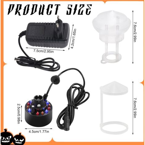Luejnbogty Brumisateur, brumisateur d'intérieur pour fontaine, petit Brumisateur Interieur Gutecomuik Brumisateur D'intérieur à 12 LED Pour Fontaine à Eau, Petite Machine à Brouillard De Bassin, Humidificateur D'air, Parfait Pour Fontaine D'eau, Étang, Halloween, Décoration De Noël (Noir Brumisateur Ultrason Idéal pour les fontaines d'intérieur ou d'extérieur, les jeux d'eau, les aquariums et les bureaux. Spécifications : Matériau du véhicule : ABS Température : 1-45°C Profondeur d'eau : 5-7 cm Nombre de LED : 12 LED (rouge + jaune + bleu) Longueur du câble: 1,25 m Diamètre du brouillard : 20 mm Profondeur d'eau : 6-10 cm Le costume comprend: 1 x Machine à Brouillard 1 x Adaptateur Remarque : 1., Ne touchez pas la tranche d'atomisation lorsque le brumisateur fonctionne., 2., Veuillez éteindre l'appareil avant de le déplacer ou de l'entretenir. Vous pouvez le placer dans votre bassin, rocaille, aquarium, vase, bain d'oiseaux, etc. Effets de Brouillard : Le brumisateur peut ajouter un effet de brouillard étonnant à votre étang. · Mode 12 LED Mode 12 LED : Le brumisateur ultrasonique est équipé de 12 LED qui clignotent de façon aléatoire la nuit pour attirer l'attention. Créez un effet magique : ce brumisateur de fontaine peut ajouter une grande quantité de brume à votre étang, réservoir d'eau ou tout autre élément aquatique... Facile à Utiliser : Le voltage est de 24V. Effets de Brouillard : Le brumisateur peut ajouter un effet de brouillard étonnant à votre étang.